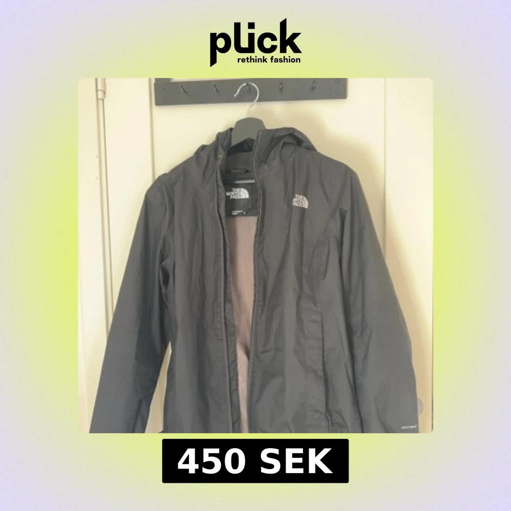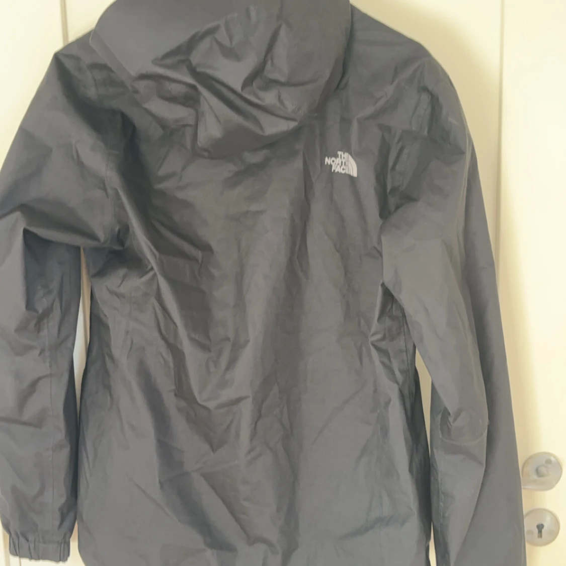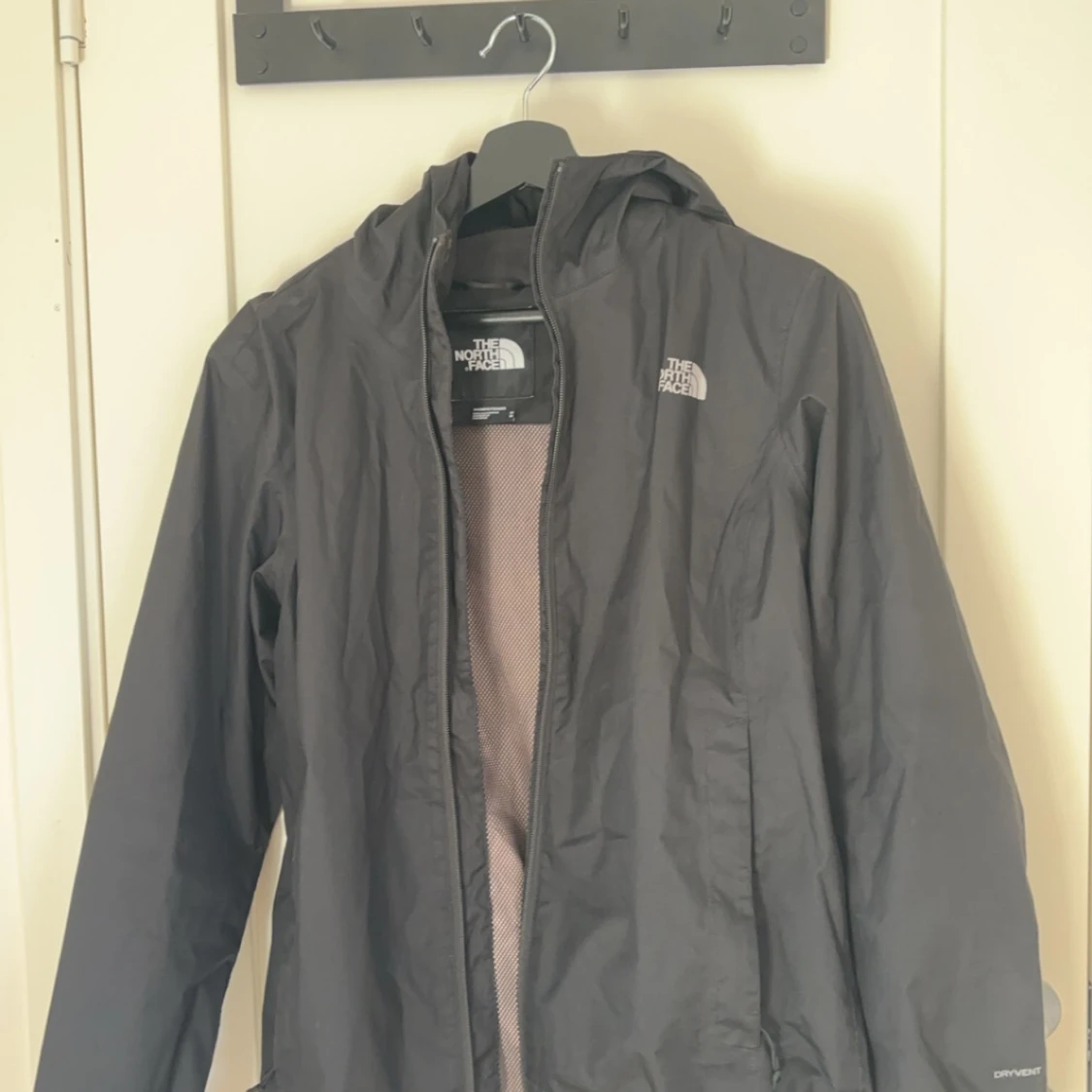 Säljer en svart vindjacka från The North Face med huva och dragkedja. Storleken på jackan är M men den sitter mer som S