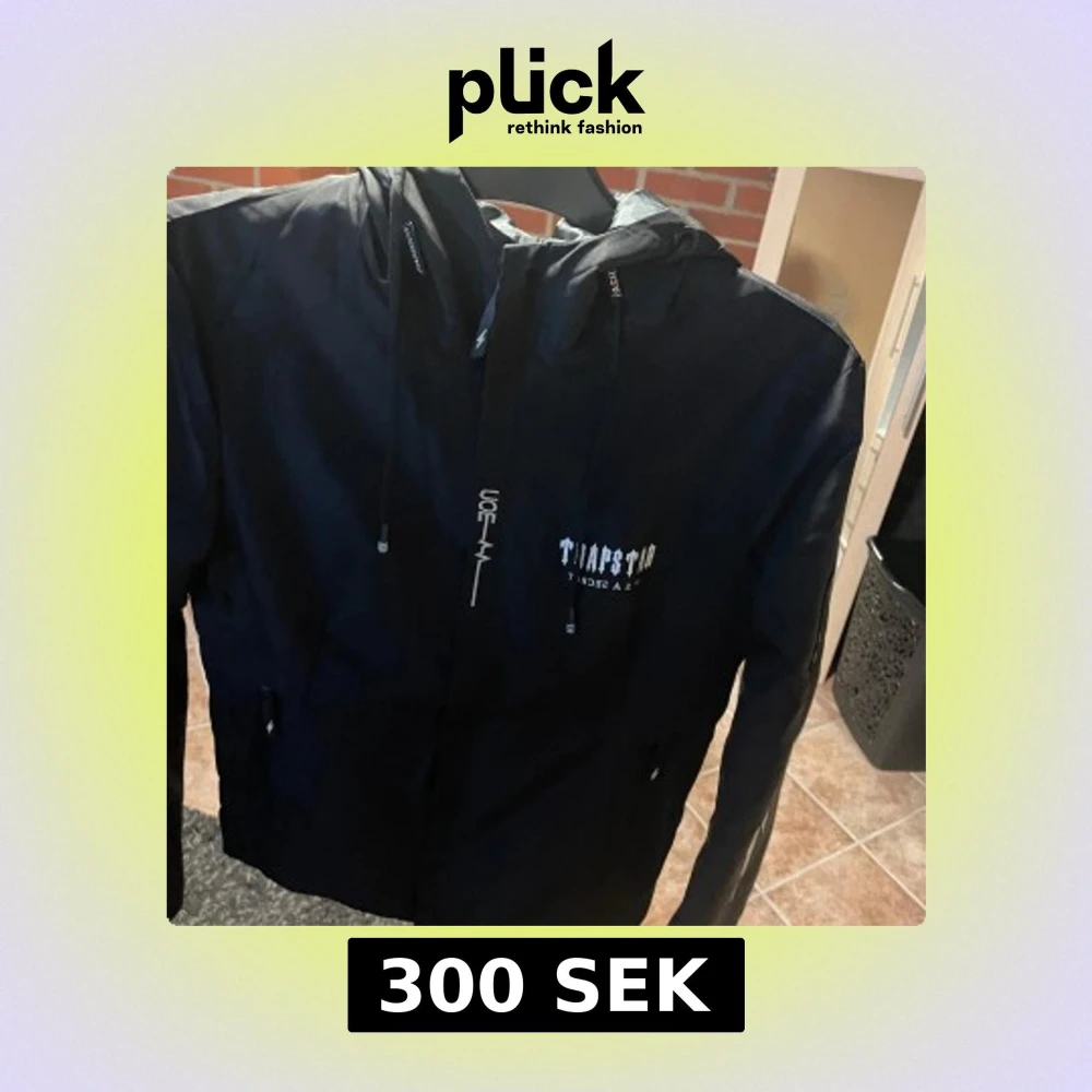 Snygg svart vindjacka från Trapstar med huva och dragkedja. Jackan har tryck på både fram- och baksidan. Perfekt för blåsiga dagar.