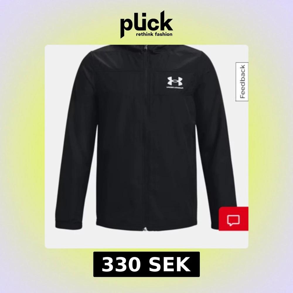 Snygg svart vindjacka från Under Armour med huva och vit logga på bröstet. Jackan har hel dragkedja. Vit på insidan. Storlek 147cm till160
