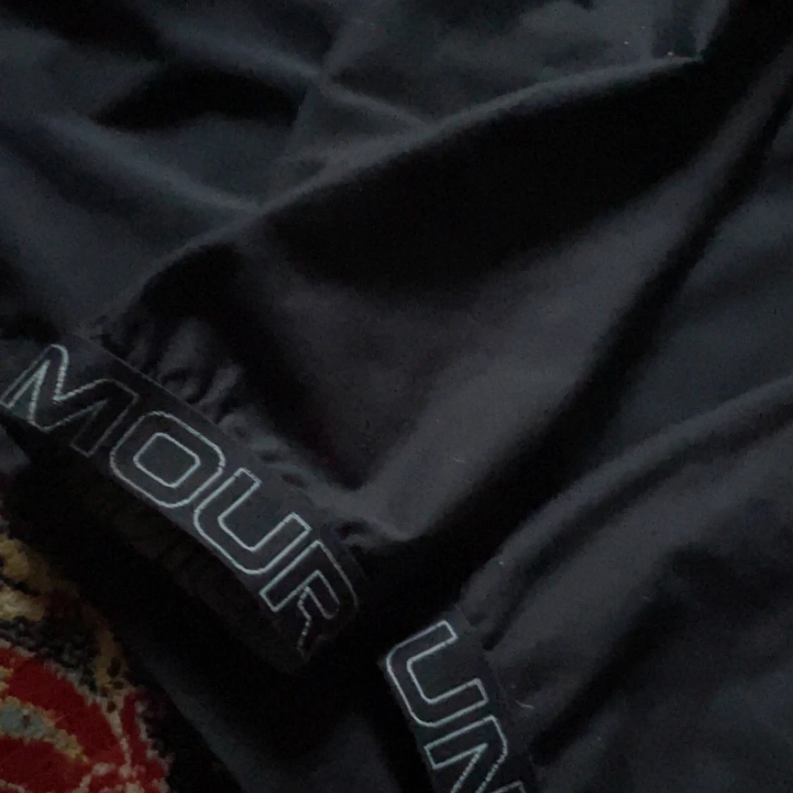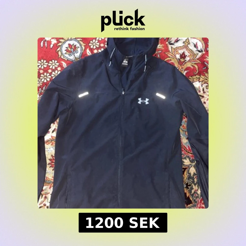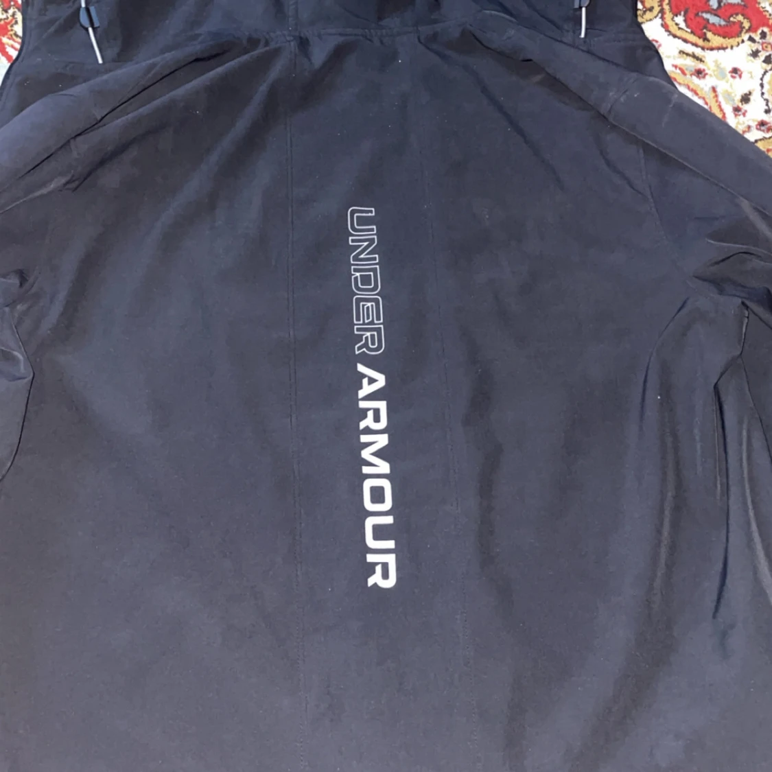 Svart vindjacka från Under Armour med huva och hel dragkedja. Jackan har reflekterande detaljer på bröstet, logga på bröstet och stor text på ryggen. Tillverkad i lätt polyester, perfekt för aktiva dagar. Elastiska muddar med logotypdetalj.