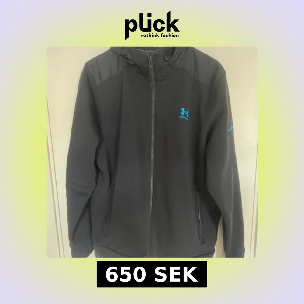 Svart vindjacka från Under Armour med huva och hel dragkedja. Jackan har blå logga på bröstet och är tillverkad i syntetmaterial. Perfekt för dig som gillar sportig stil och vill ha något lätt och smidigt till vardagen.