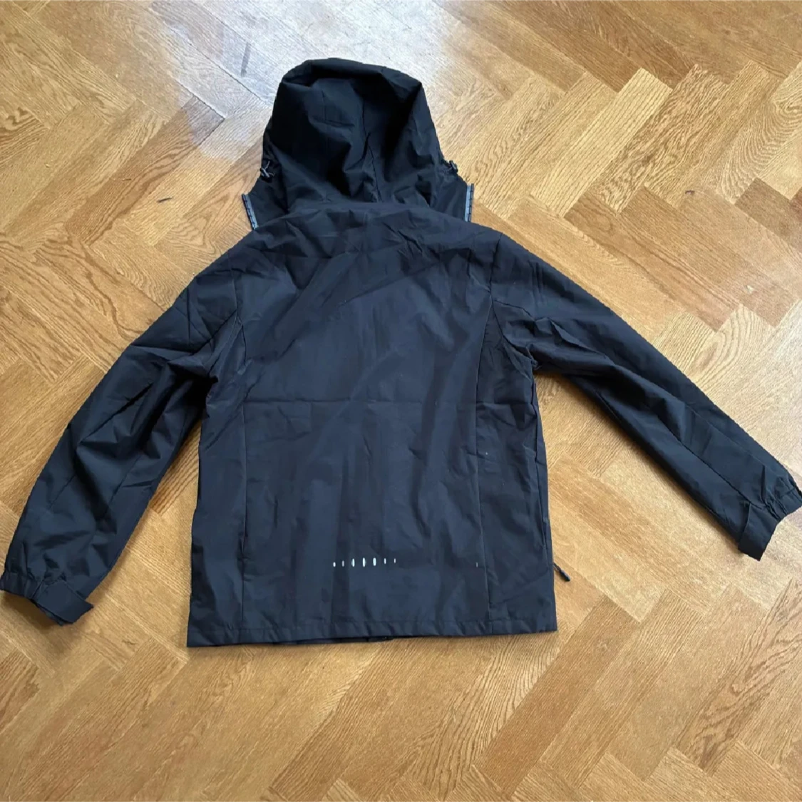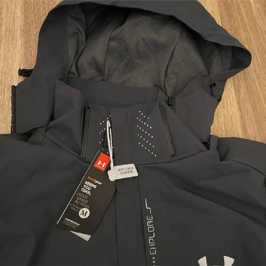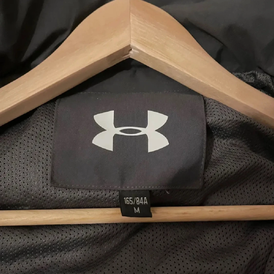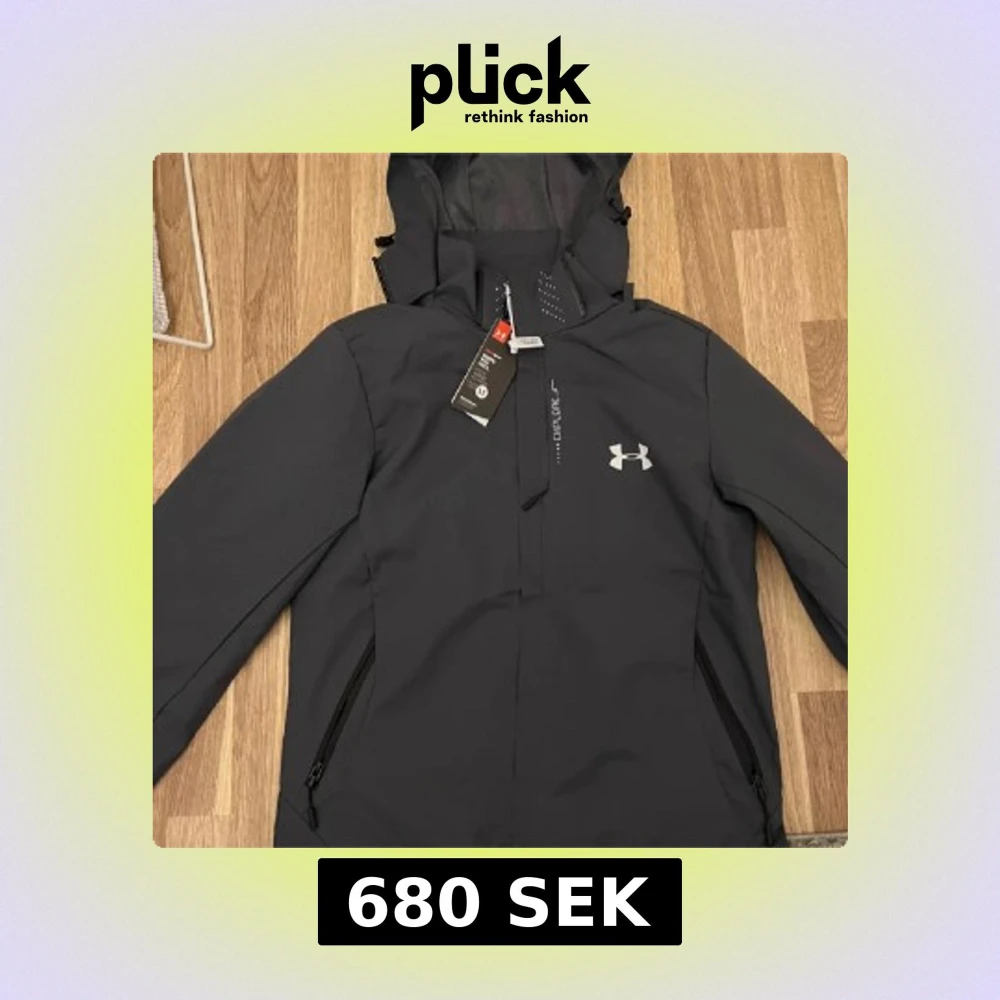 Svart vindjacka från Under Armour med vit logga på bröstet och texten 'EXPLORE'. Jackan har huva, dragkedjor på fickorna och meshfoder på insidan. Perfekt för blåsiga dagar och sportiga outfits.