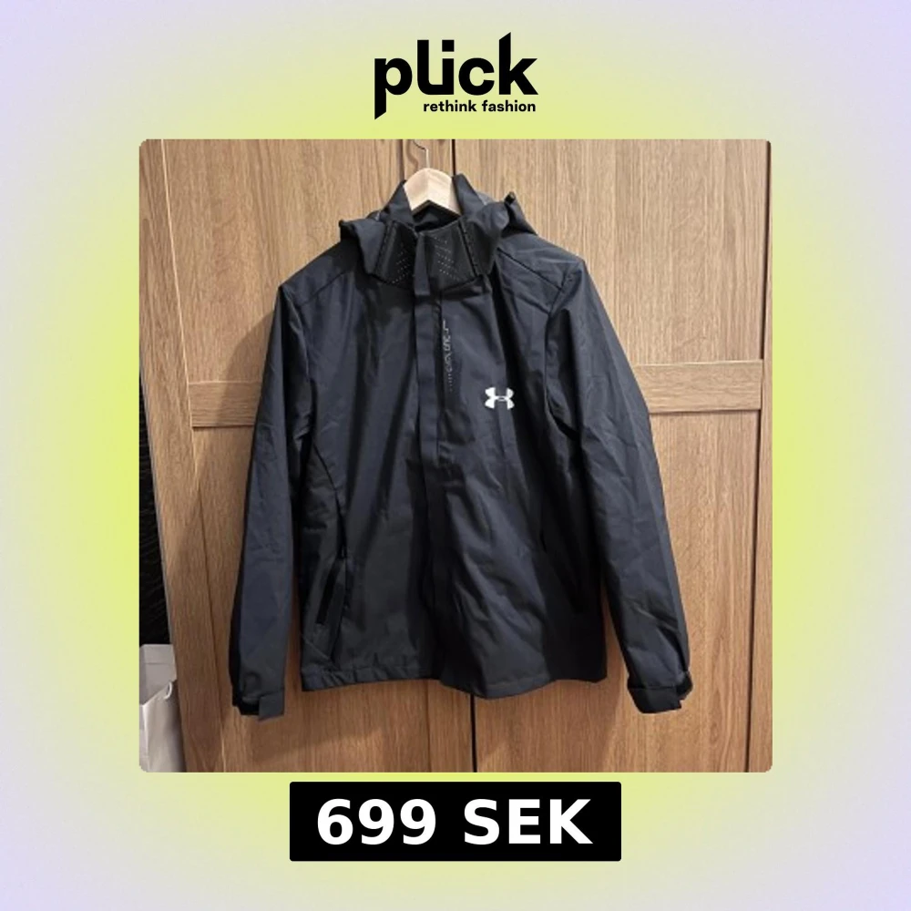 Svart vindjacka från Under Armour med huva och dragkedja. Jackan har meshfoder, två sidofickor med dragkedja och en innerficka. Vatten- och vindtåligt material i polyester, perfekt för blåsiga dagar. Snygg logga på bröstet och stilren design. Nypris 1100kr. Denna jackan är helt ny eftersom jag beställde för liten storlek.