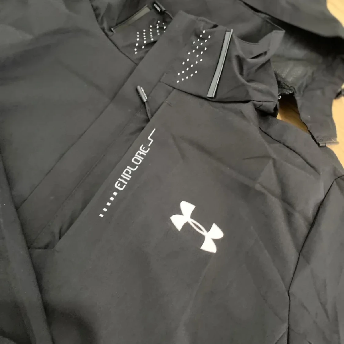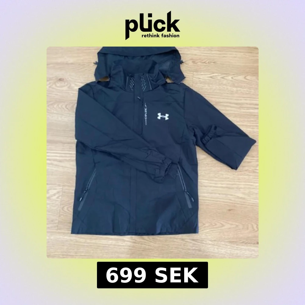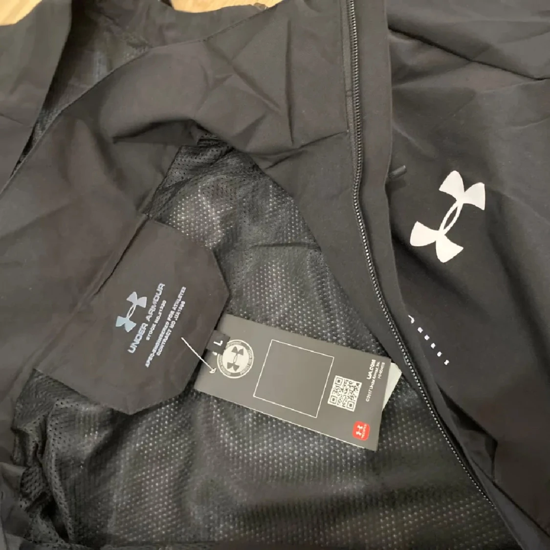 Svart vindjacka från Under Armour med vit logga på bröstet, huva och dragkedjor på fickorna. Jackan har meshfoder, elastiska muddar och detaljer med tryck. Perfekt för dig som gillar sportig och clean stil.