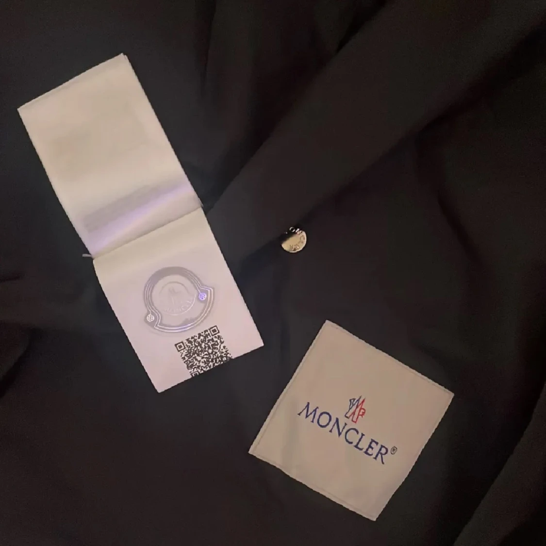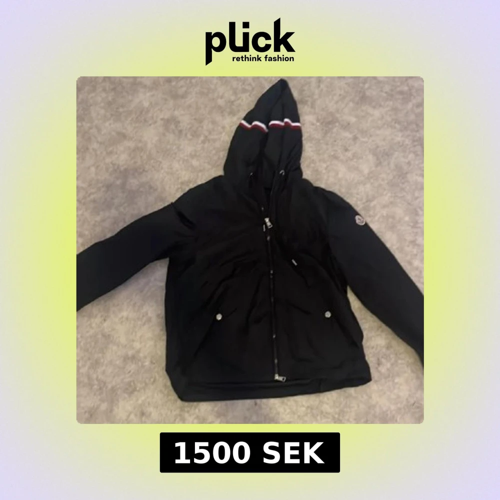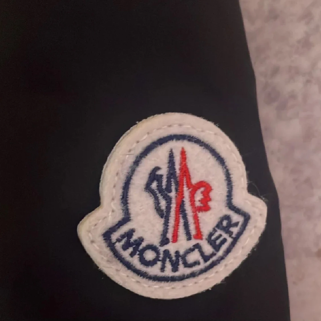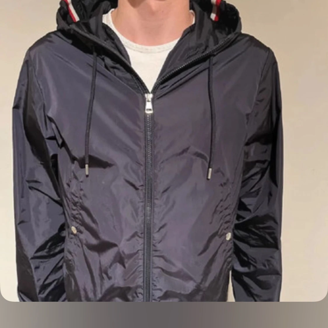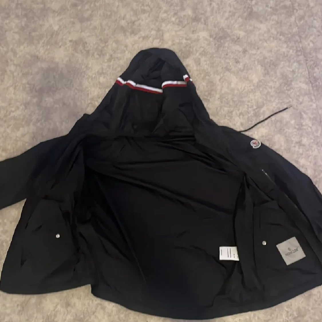 Svart vindjacka från Moncler med huva och dragkedja framtill. Jackan har Moncler-logga på ärmen och vita samt röda ränder på huvan. Två fickor med tryckknappar och stilren design. Perfekt för dig som vill ha en snygg och sportig look.