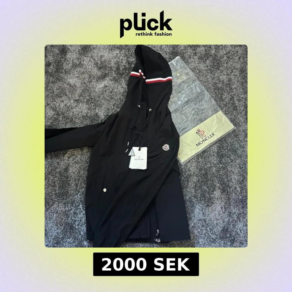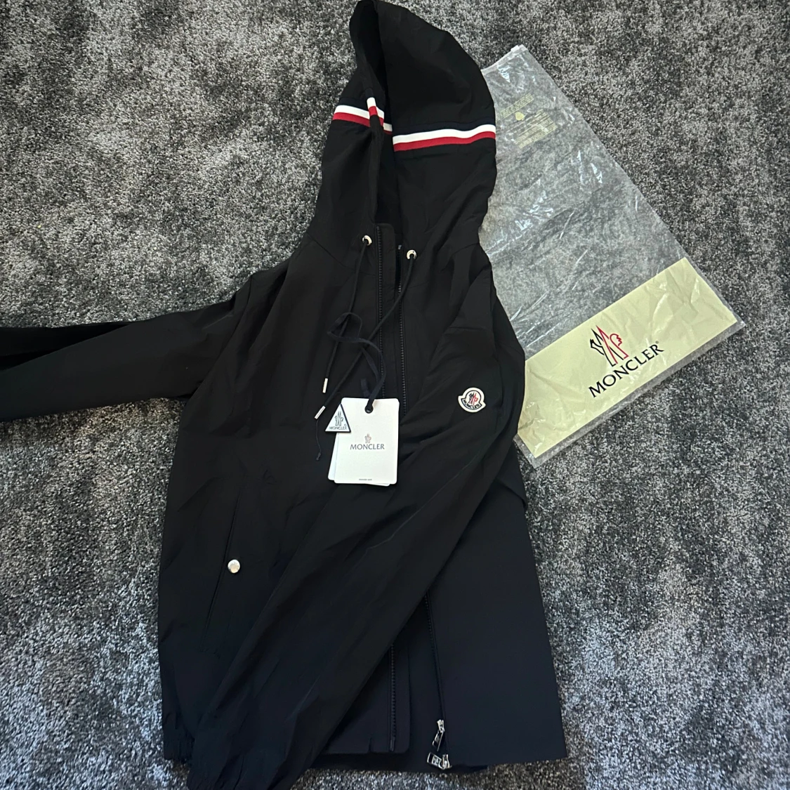 Svart vindjacka från Moncler med huva och snörning, dekorerad med röd och vit rand på huvan. Jackan har dragkedja framtill, sidofickor med tryckknappar och Moncler-logga på bröstet. Perfekt för dig som gillar stilren och sportig look.