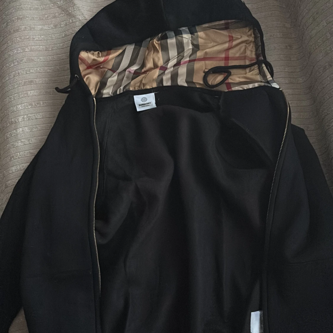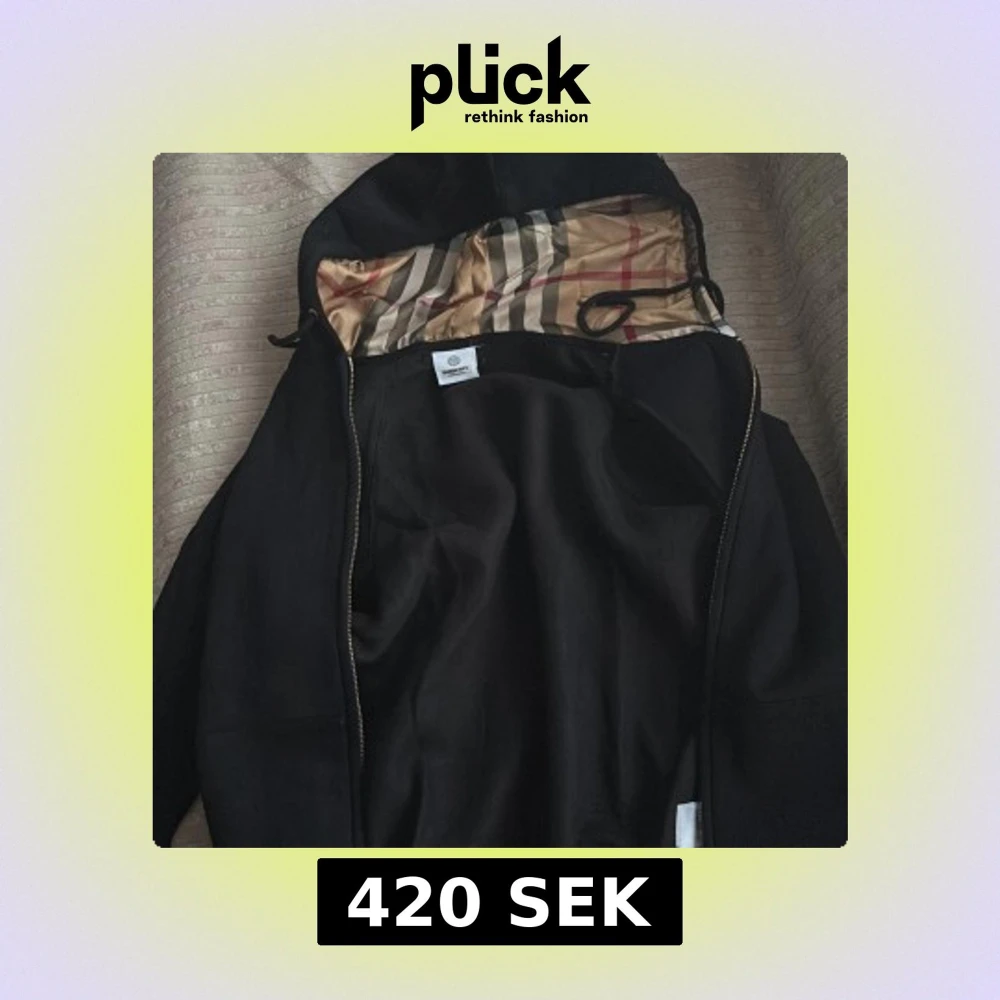 Svart vindjacka från Burberry med klassiskt randigt innerfoder i beige, rött och grått. Jackan har huva med dragsko och dragkedja framtill. Perfekt för dig som vill ha en stilren jacka med lyxig känsla och snygga detaljer.