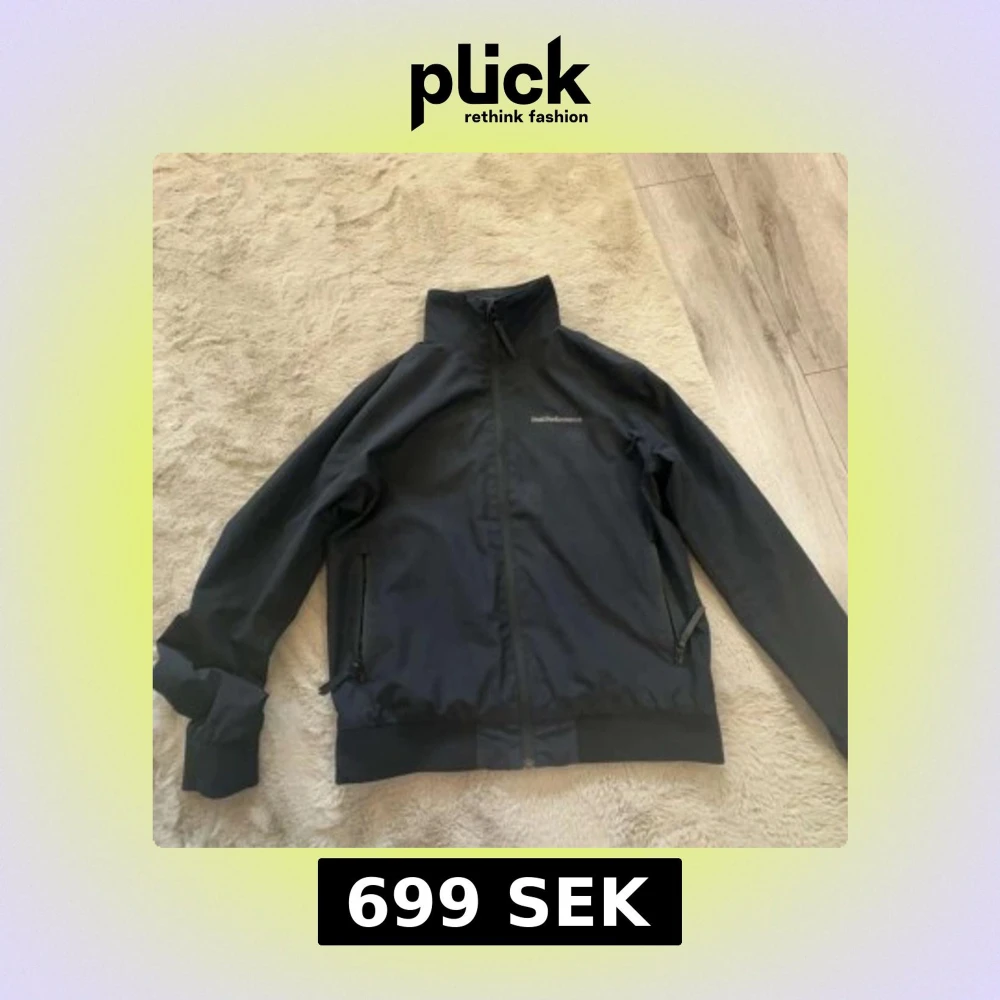 Svart vindjacka från Peak Performance med hög krage, hel dragkedja och två fickor med dragkedja. Jackan har diskret logga på bröstet och en metallogo på ärmen. Tillverkad i lätt och smidigt syntetmaterial, perfekt för blåsiga dagar. Använd men fortfarande i jätte fint skick.
