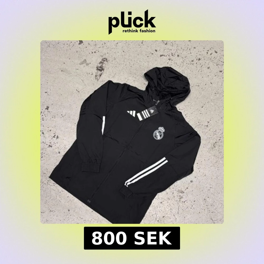 Svart vindjacka från Adidas med Real Madrid-logga på bröstet. Jackan har huva, hel dragkedja och vita ränder längs ärmarna. Perfekt för dig som gillar sportig stil och vill visa ditt lagstöd.