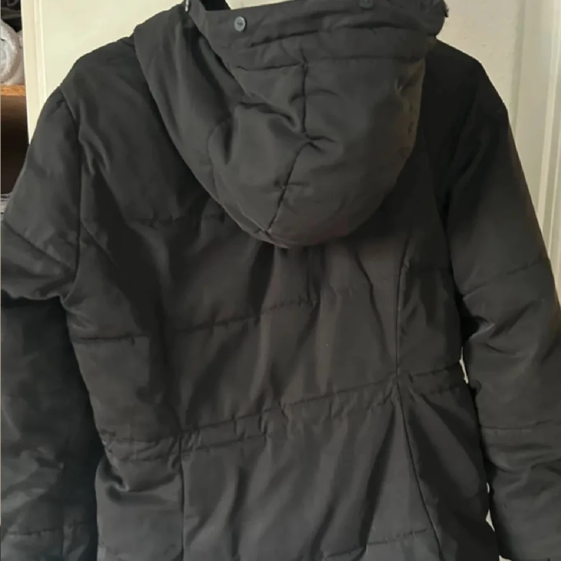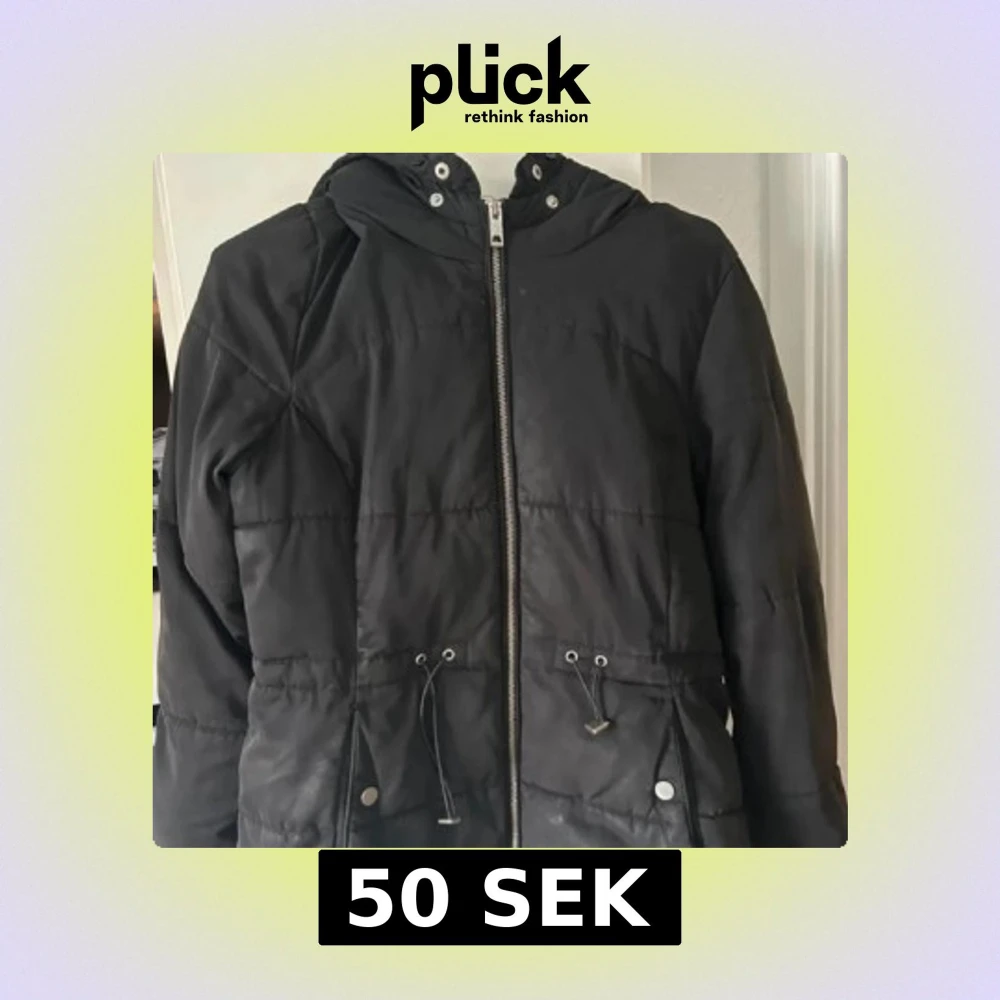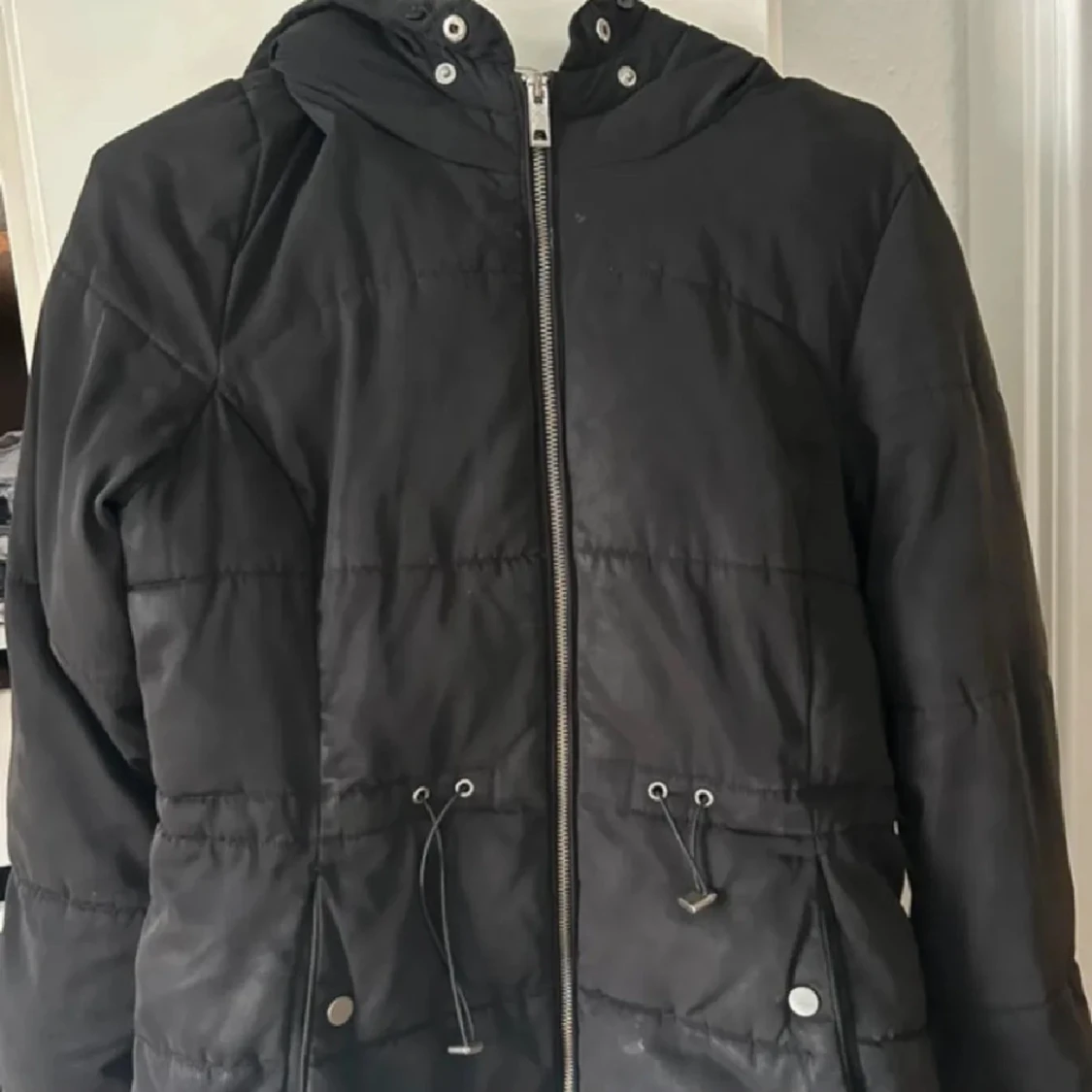 Snygg svart jacka med huva. Jackan har långa ärmar och praktiska fickor med knappar. Perfekt för kyligare dagar!💕