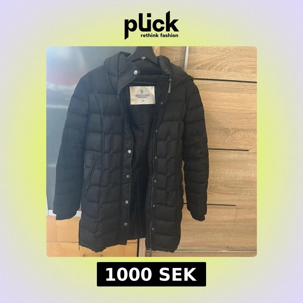 Svart vinterjacka (stl. 34) Lång, quiltad pufferjacka med huva, dragkedja och knappar framtill. Två fickor med dragkedja. Perfekt för kalla vinterdagar både varm och stilren.