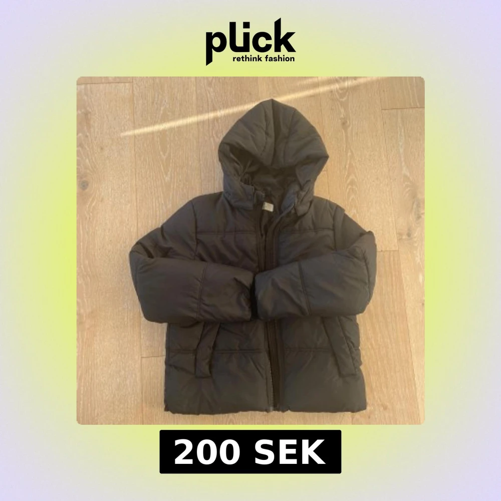 Svart pufferjacka med avtagbar huva och två stora fickor framtill i storlek 170. Jackan har en rak passform och stängs med dragkedja. Perfekt för kalla dagar och enkel att matcha med olika outfits. Motagare står för frakt.