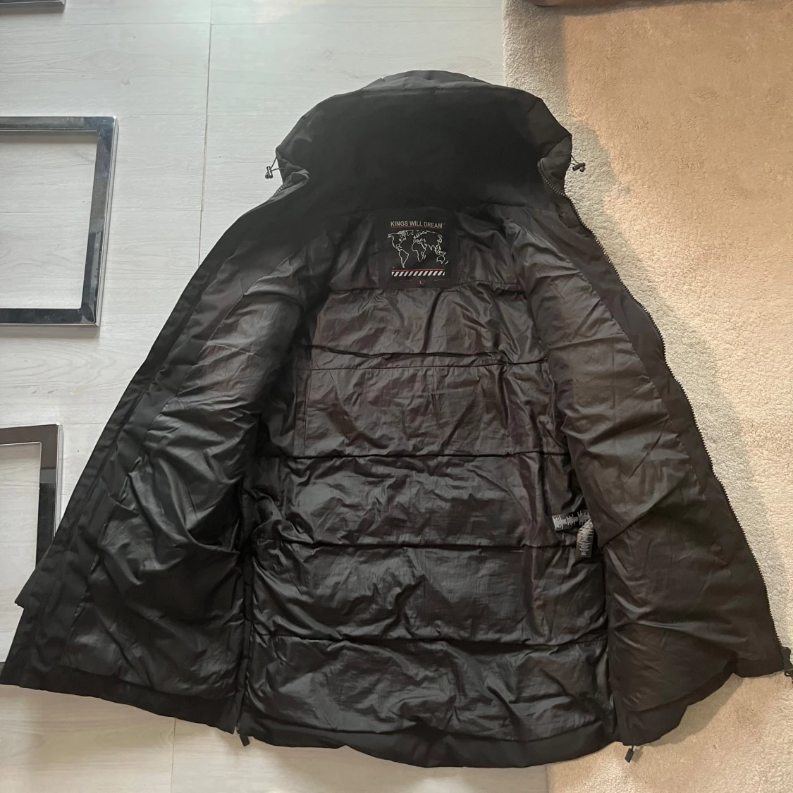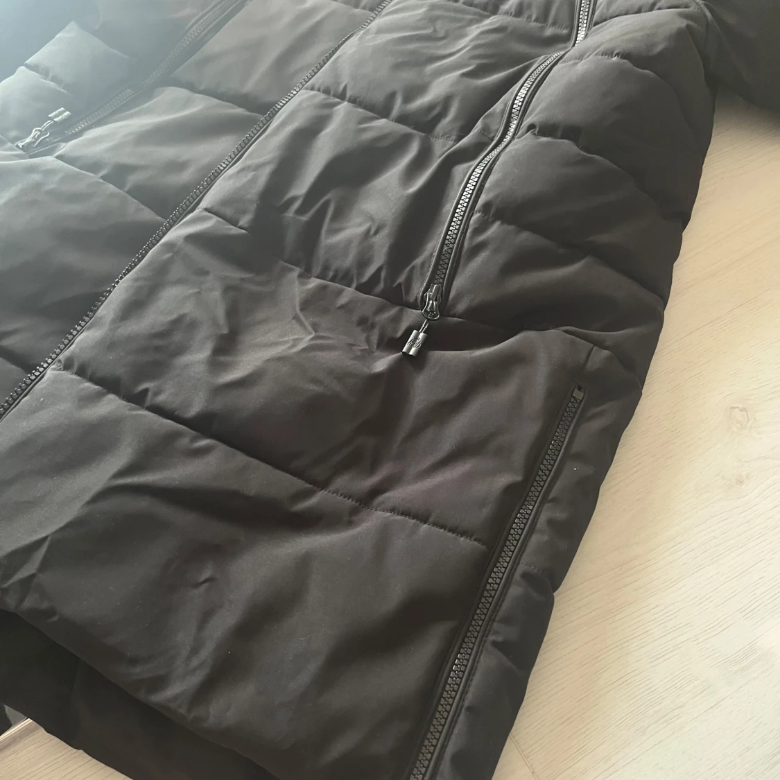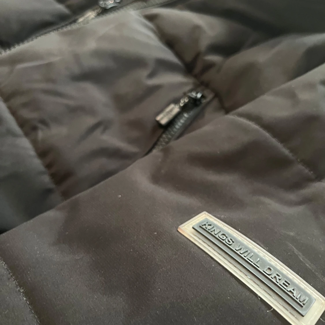 Svart lång pufferjacka från Kings Will Dream med huva och flera dragkedjor framtill. Jackan har quiltad design och raka linjer, perfekt för kalla dagar. Snygg logga på ärmen och praktiska fickor med dragkedja. Passformen är normal och jackan är fodrad för extra värme.