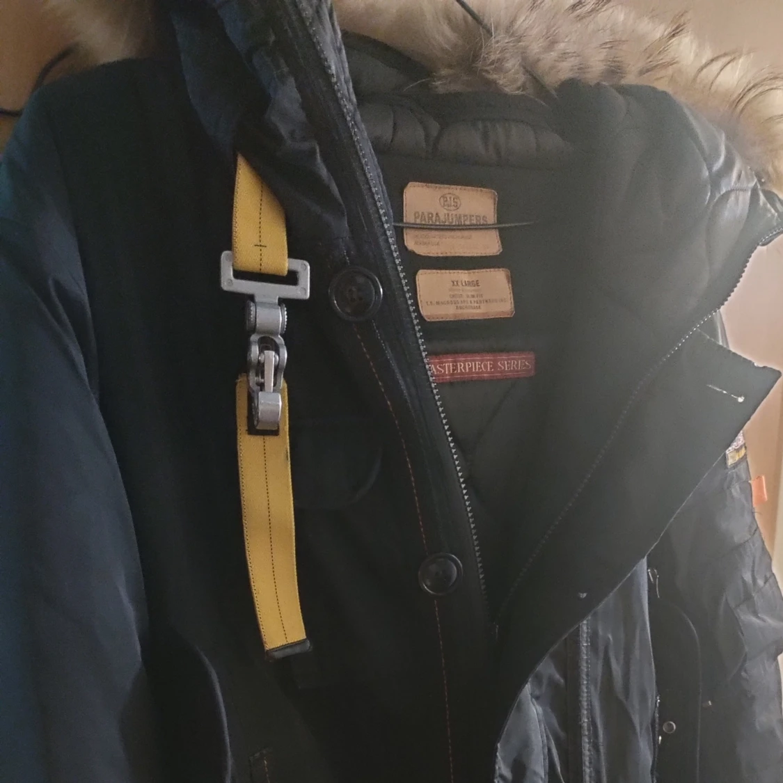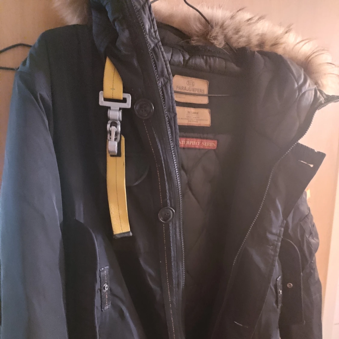 Säljer en svart vinterjacka från Parajumpers med pälsfodrad huva och gul detalj vid dragkedjan. Jackan är en del av Masterpiece Series och har en slim fit passform. Perfekt för kalla dagar.