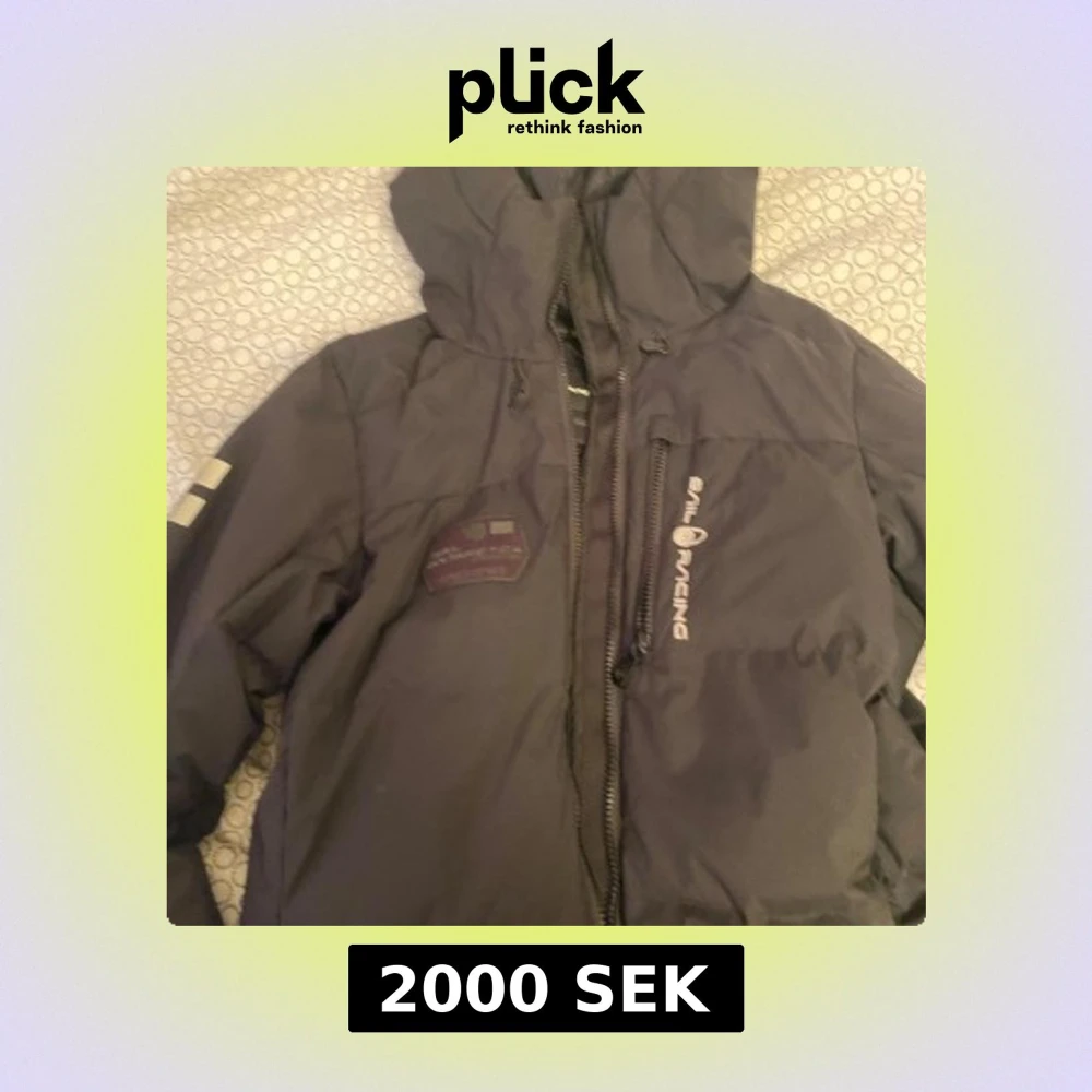 Säljer en svart vinterjacka från Sail Racing med huva och dragkedja. Jackan har en logotyp på bröstet och en på ärmen. Perfekt för kalla dagar!