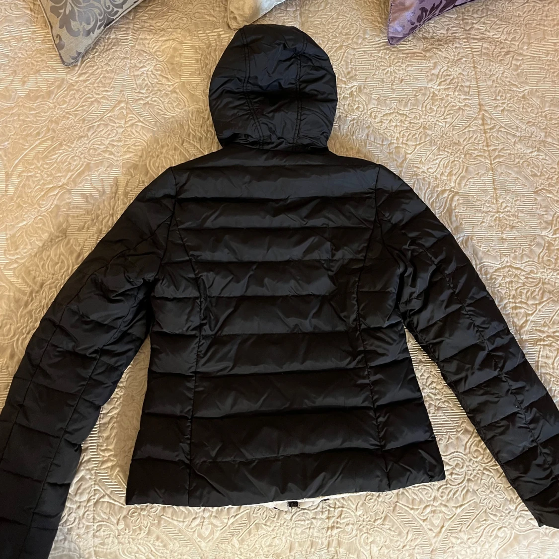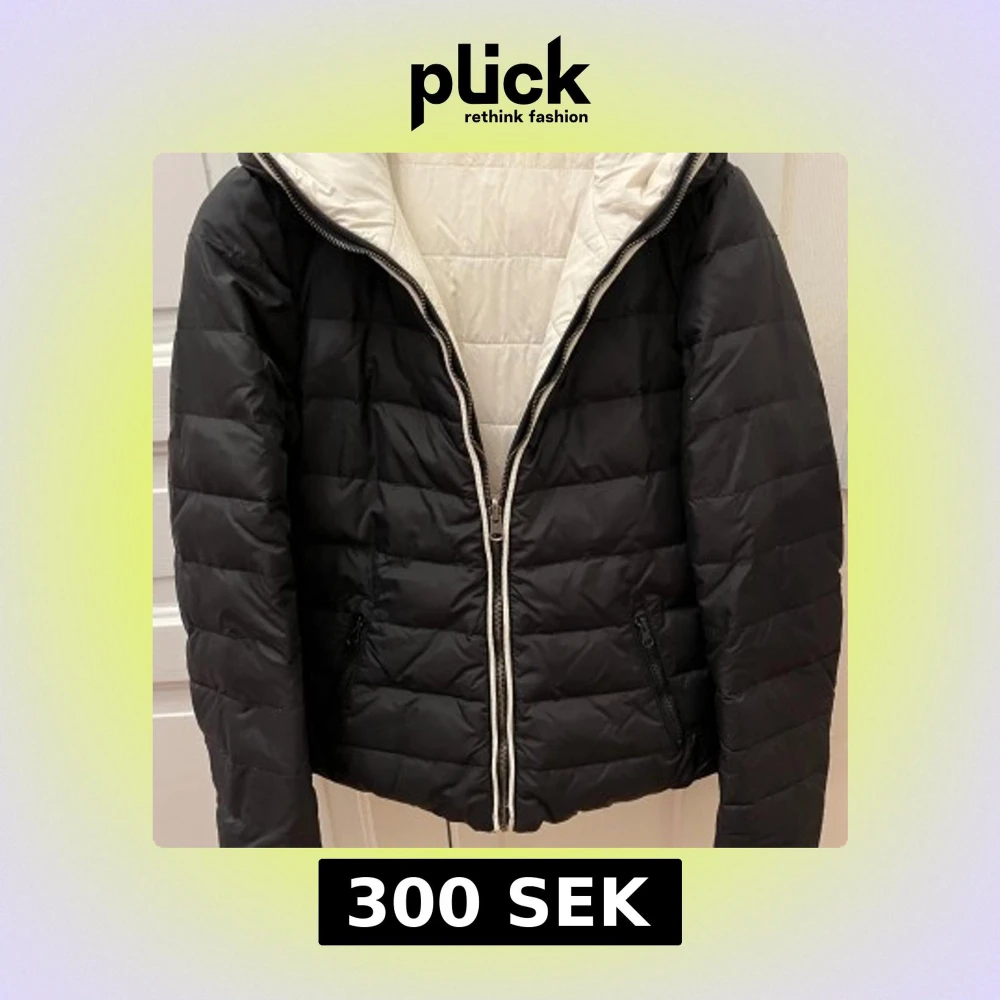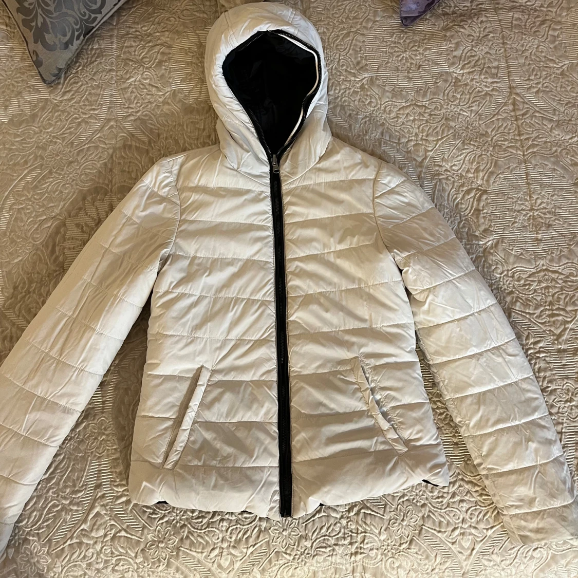 Säljer en svart pufferjacka med vit insida och dragkedja framtill. Jackan har två fickor med dragkedja, som går hela vägen upp på huvan. Perfekt för kyligare dagar och enkel att matcha med olika outfits. Den går också att vända och då är jackan helt vit.