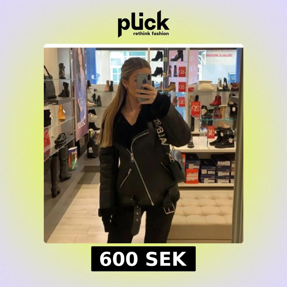 Snygg svart jacka med dragkedja och bälte.
