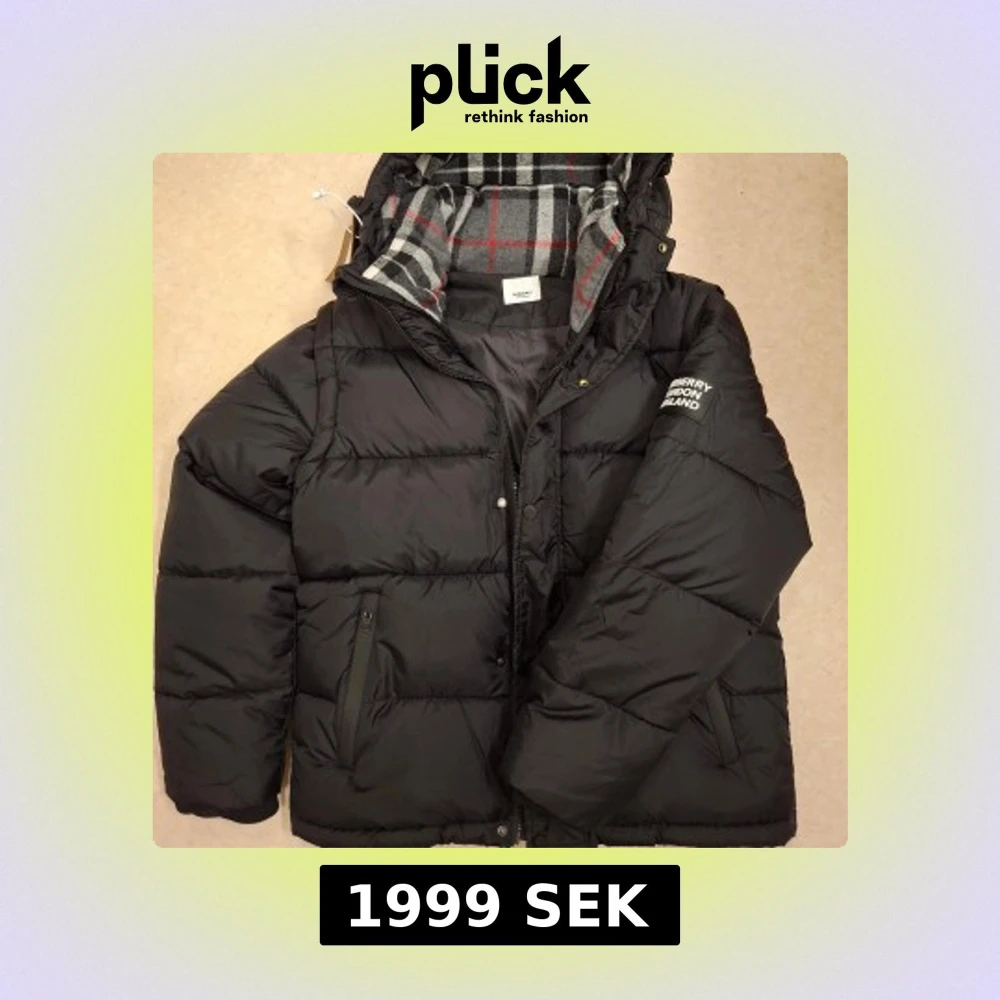 Svart pufferjacka från Burberry med huva och dragkedja. Insidan har ett rutigt foder i grått, vitt och rött. Jackan har Burberry London England-logga på ärmen, två sidofickor med dragkedja och quiltad design. Perfekt för kalla dagar och riktigt snygg stil. S men passar M också