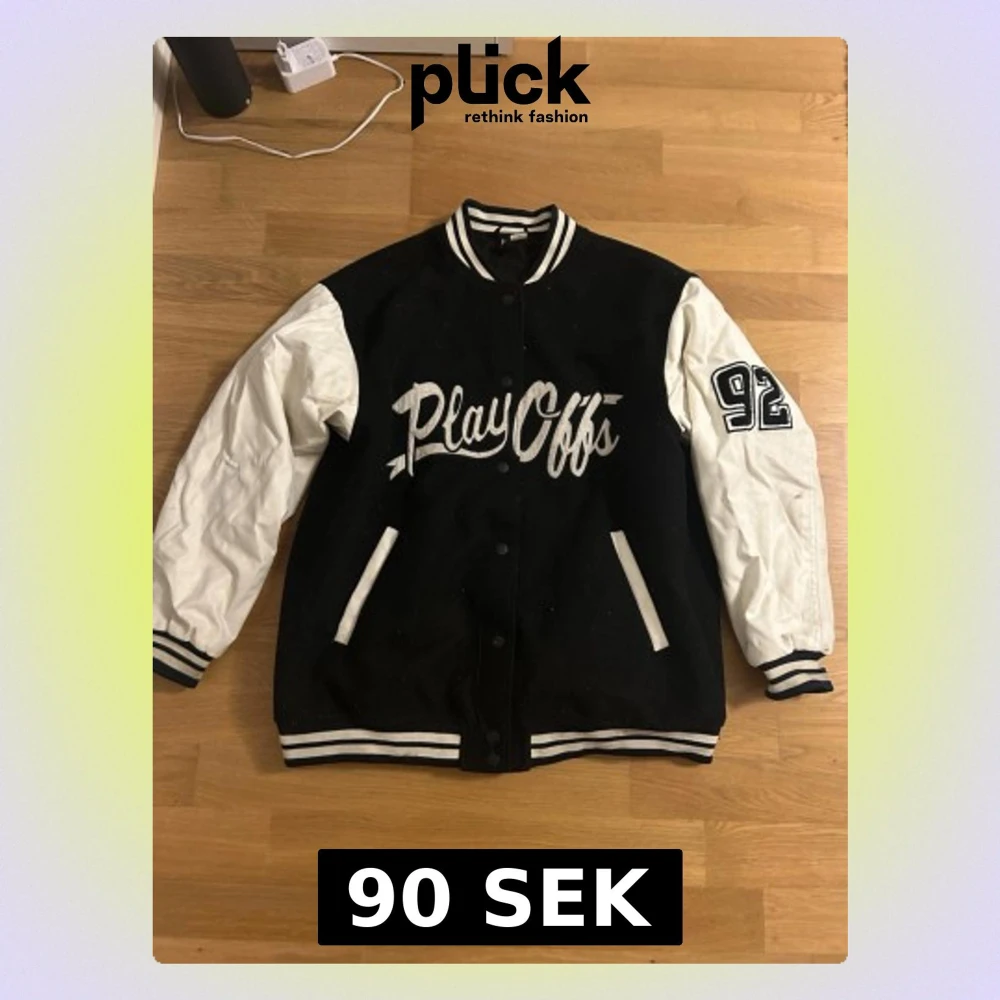 Säljer en svartvit bomberjacka från Divided i storlek S. Jackan har vita ärmar, svart kropp och broderad text 'Play Offs' samt siffran 92 på ena ärmen. Klassiska ränder på muddar och krage, stängs med knappar framtill. Perfekt för en sportig och trendig look.