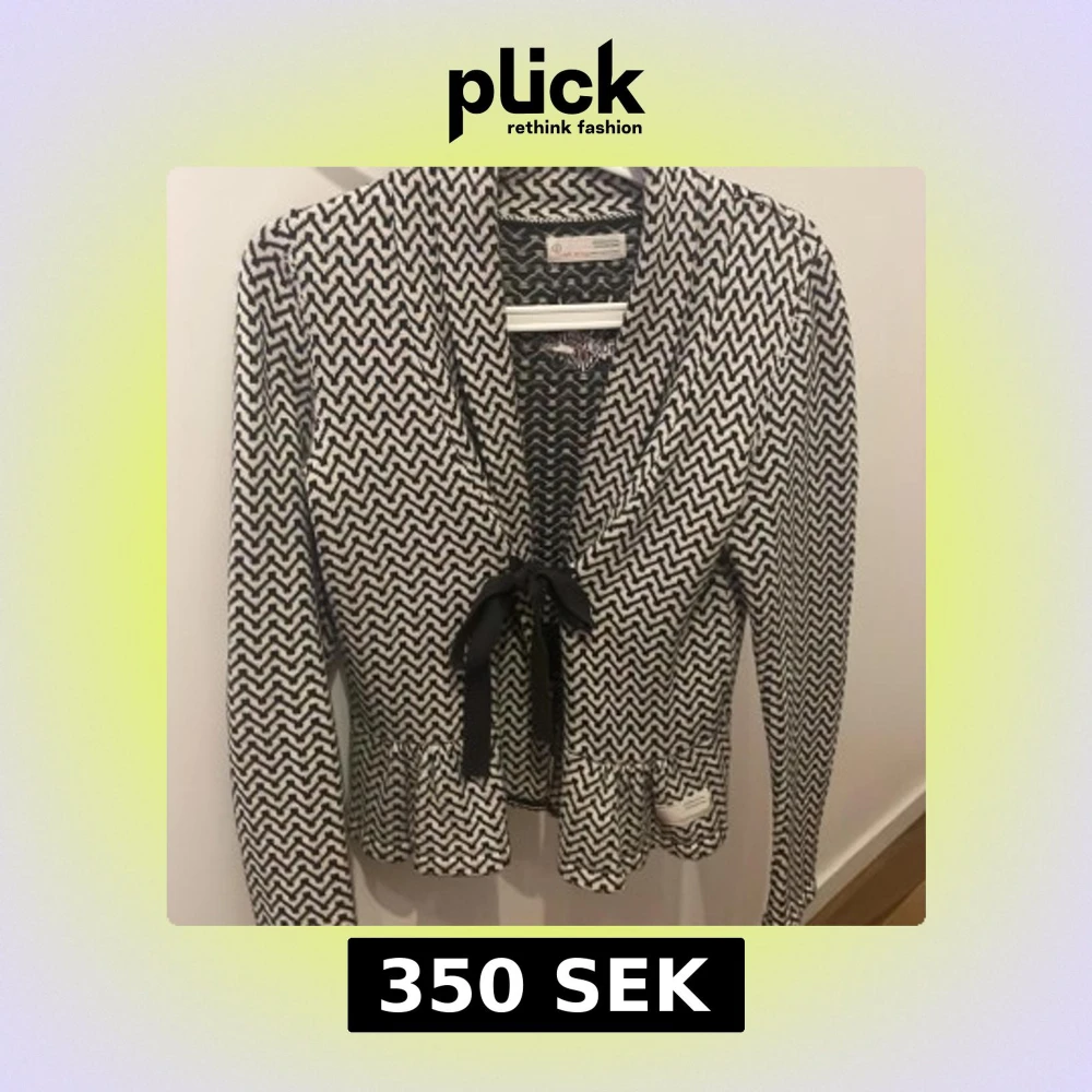 Säljer en snygg svartvit mönstrad jacka från Odd Molly. Jackan har långa ärmar och ett knytband framtill. Den har ett unikt mönster och en volangdetalj vid nederkanten. Perfekt för att ge din outfit en extra touch!