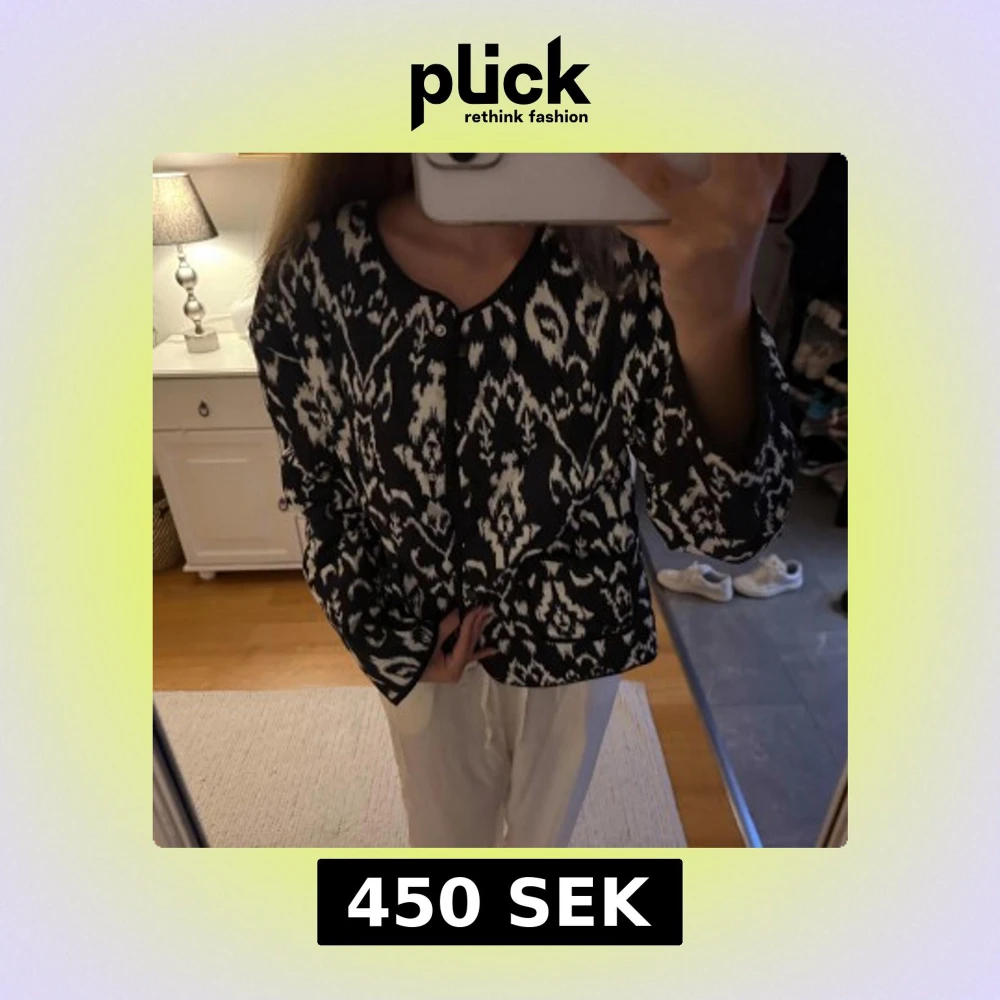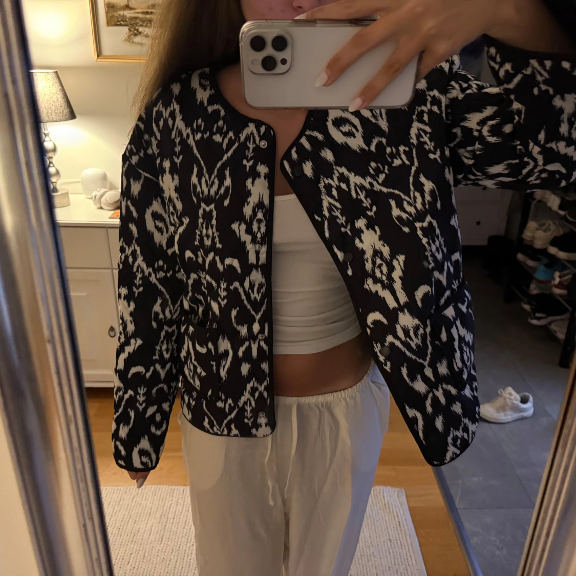Säljer en svartvit overshirt med unikt rutigt mönster och rund halsringning. Jackan har knappar framtill och raka, långa ärmar. Perfekt för dig som vill sticka ut med en cool och trendig look.