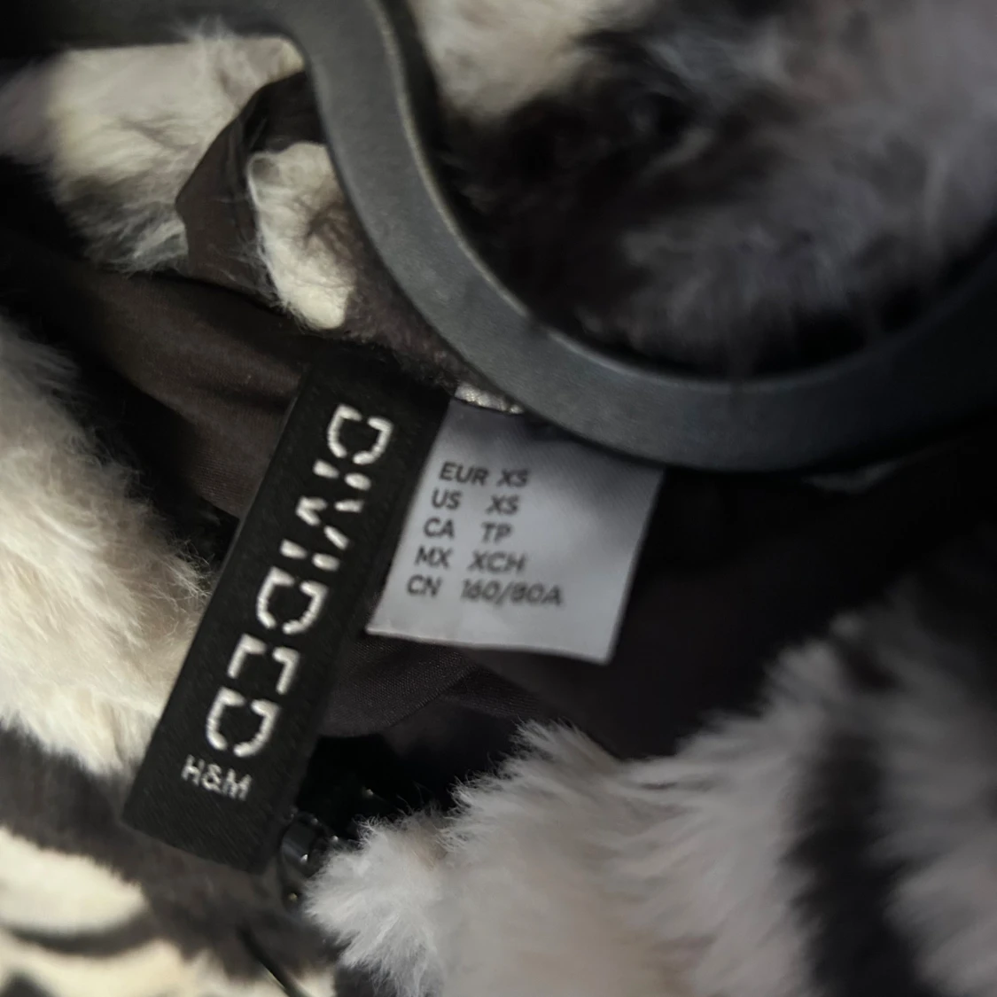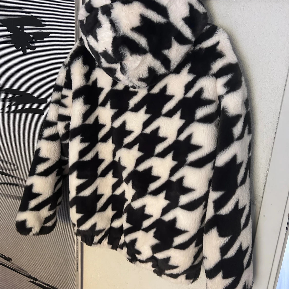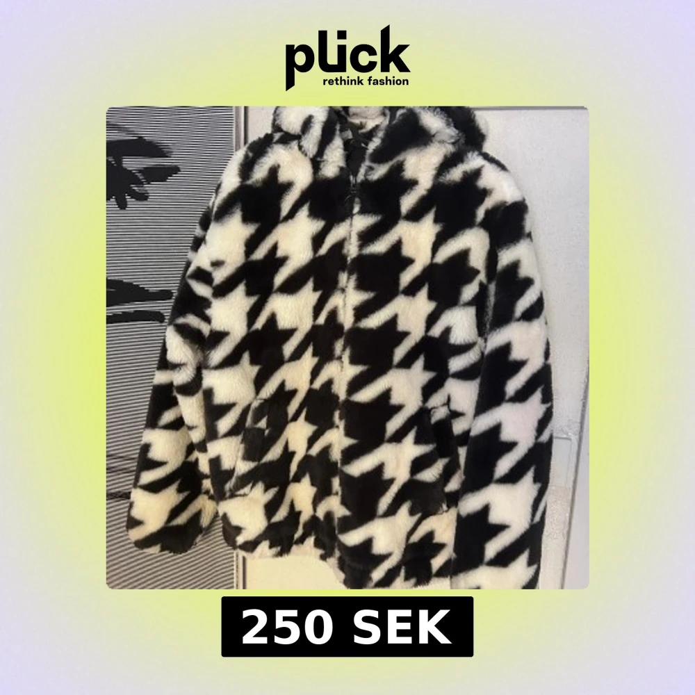 Fluffig och oversized pälsjacka med huva från H&M Divided i storlek XS. Jackan har ett fett svartvitt rutigt mönster, dragkedja framtill och två sidofickor. Perfekt för dig som vill sticka ut med en bold look under höst och vinter.