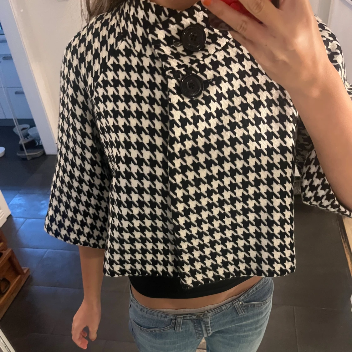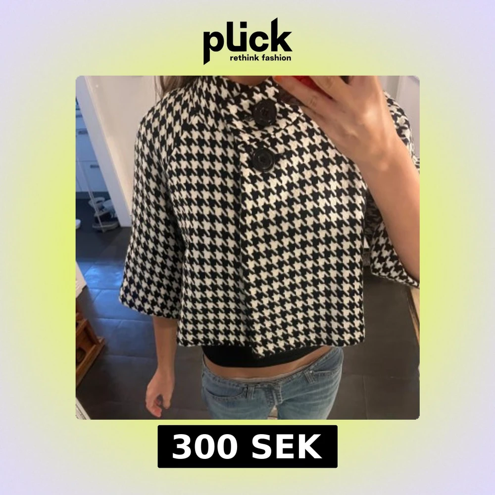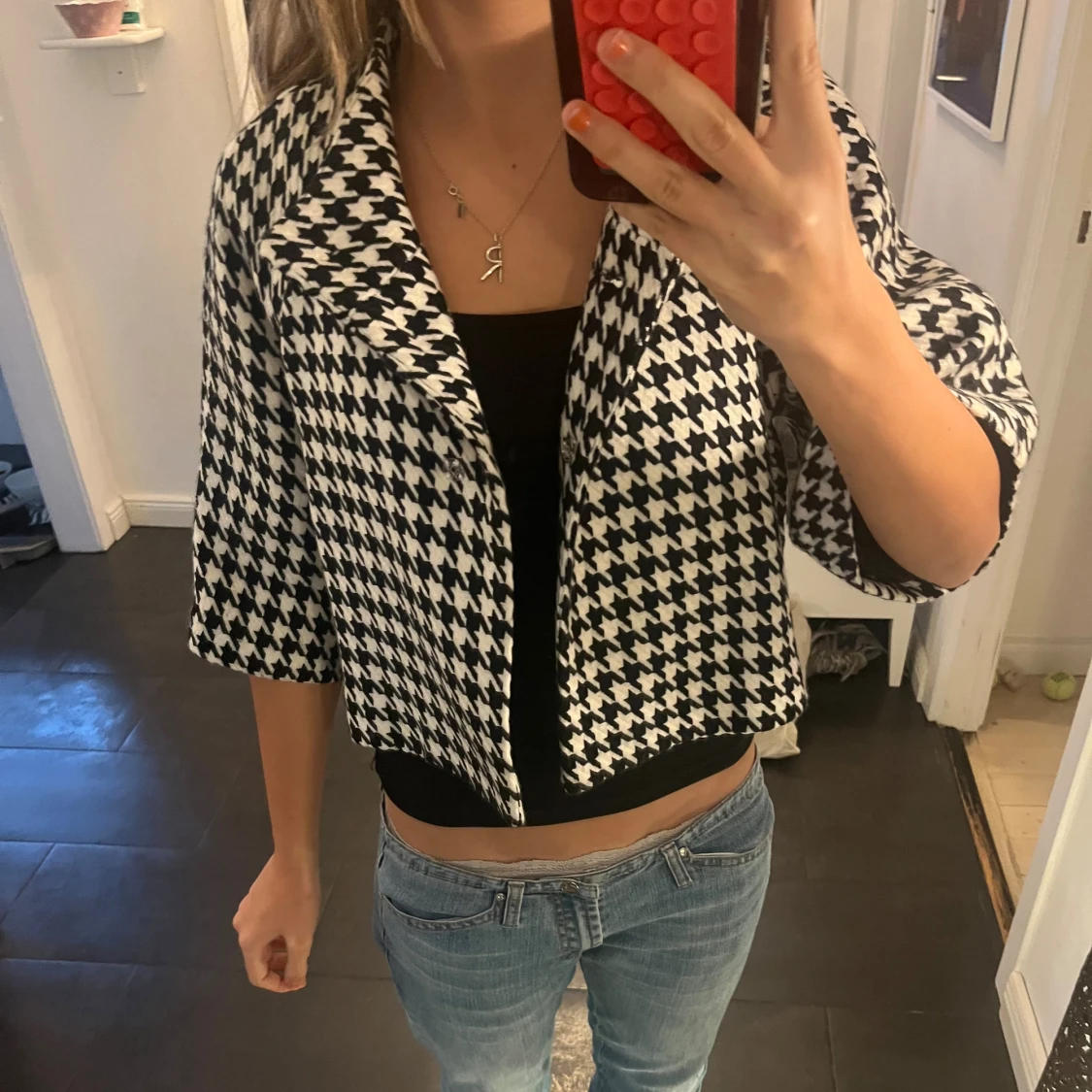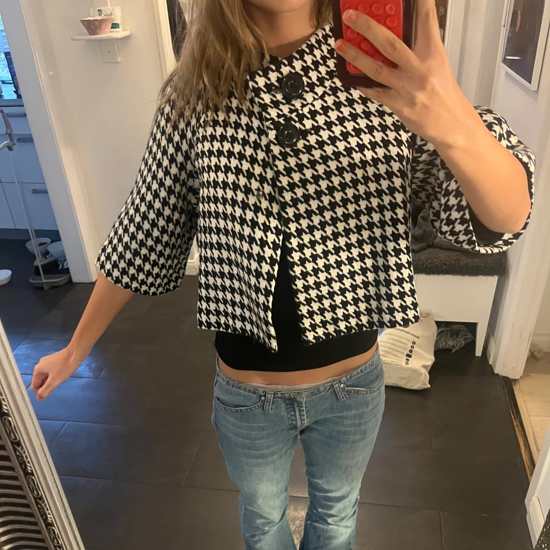 Säljer en croppad jacka i svartvitt hundtandsmönster med stora knappar framtill och trekvartsärmar. Jackan har en boxig passform och är perfekt för dig som vill sticka ut. Materialet känns som en blandning av ull och syntet. Snygg till både jeans och kjol.🖤🤍