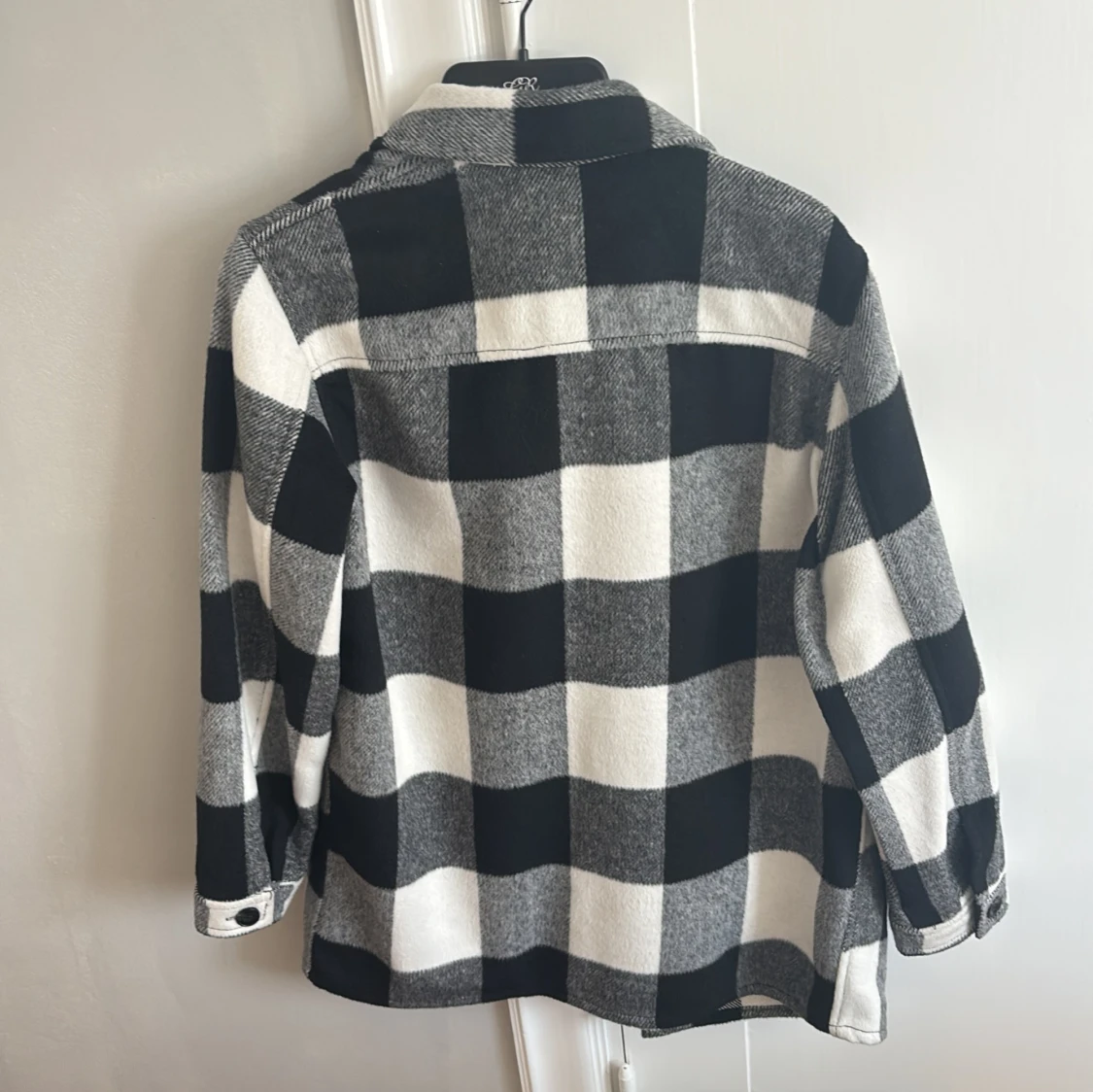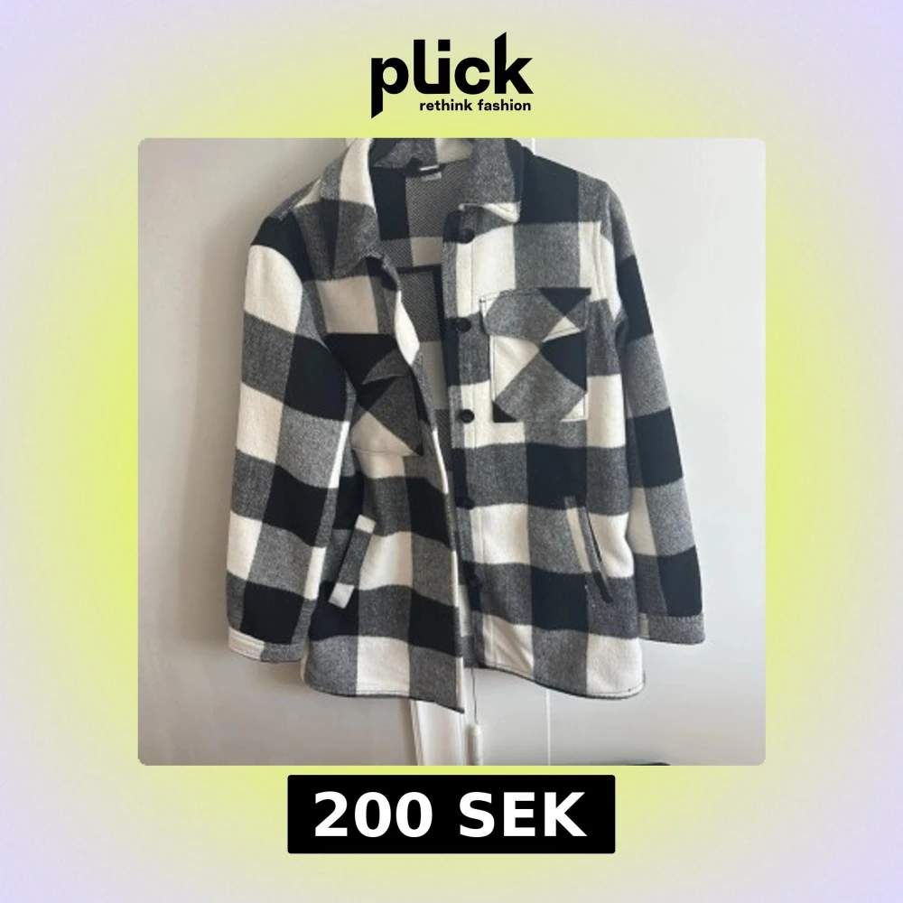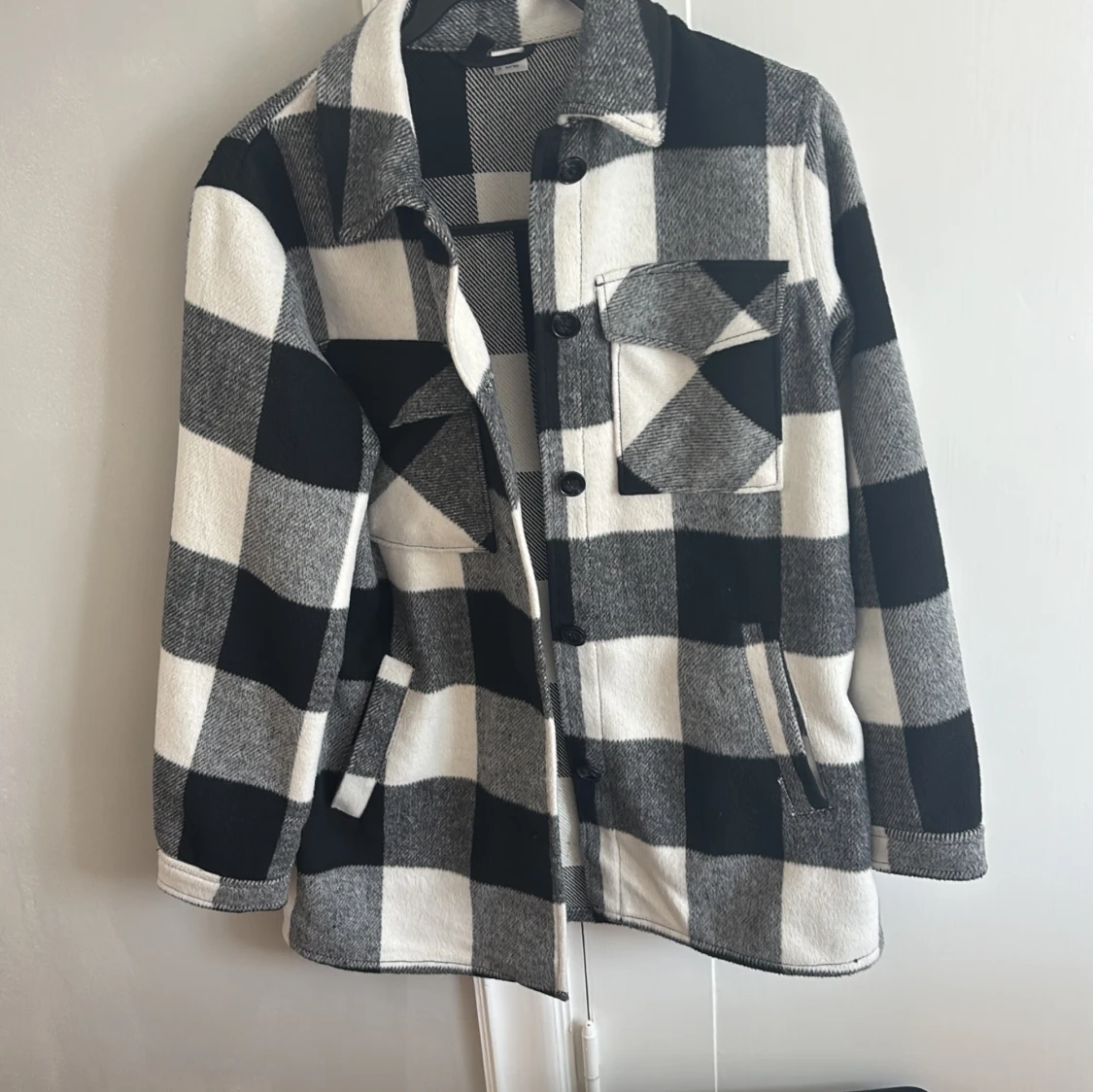 Säljer en oversized overshirt i svart och vitt med stora rutor. Jackan har knappar framtill, bröstficka och två sidofickor.