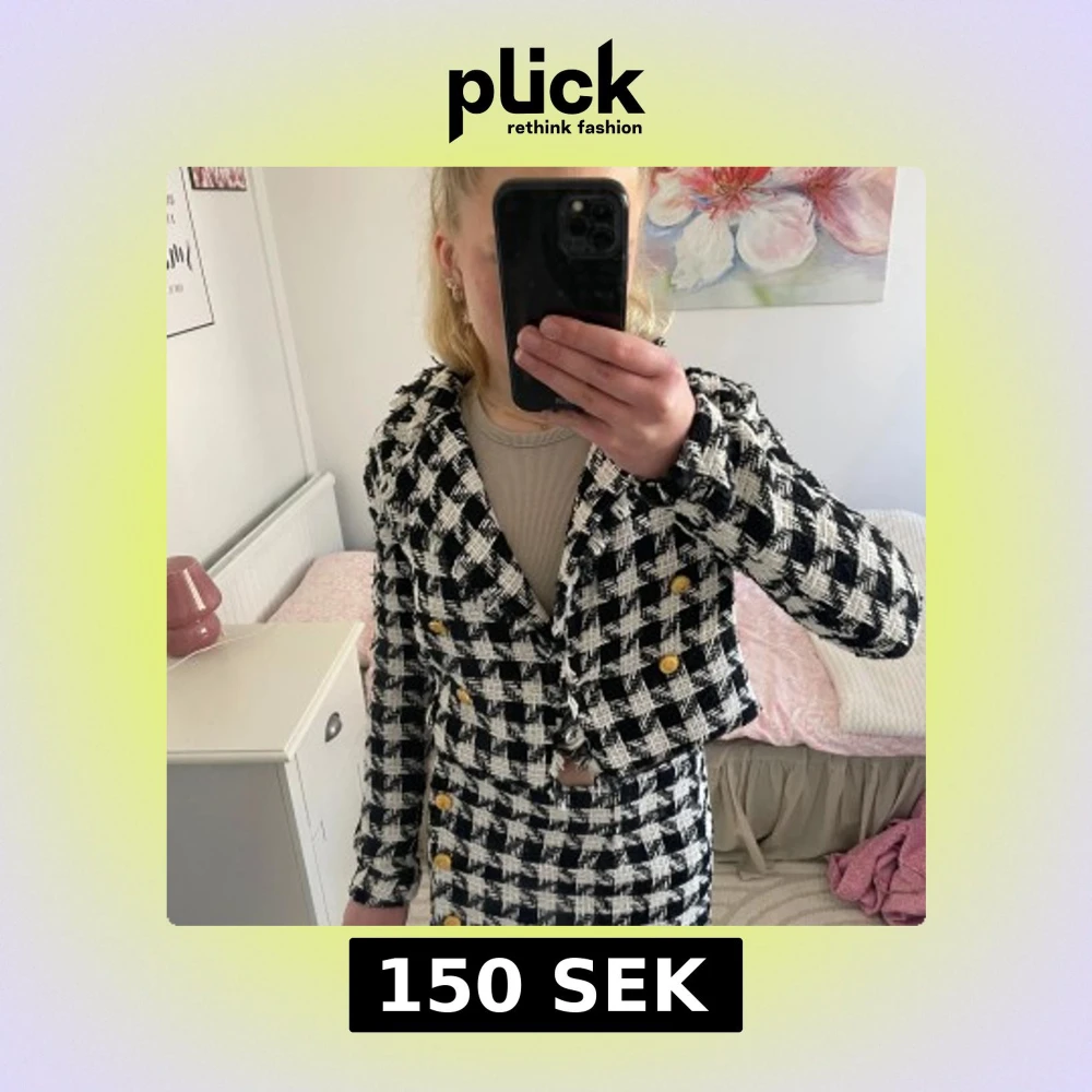 Säljer en stilren svartvit rutig kavaj från Stories. Kavajen har en croppad passform med guldknappar framtill. Tillverkad i 100% polyester, perfekt för en chic look. Passar utmärkt för både vardag och festliga tillfällen.
