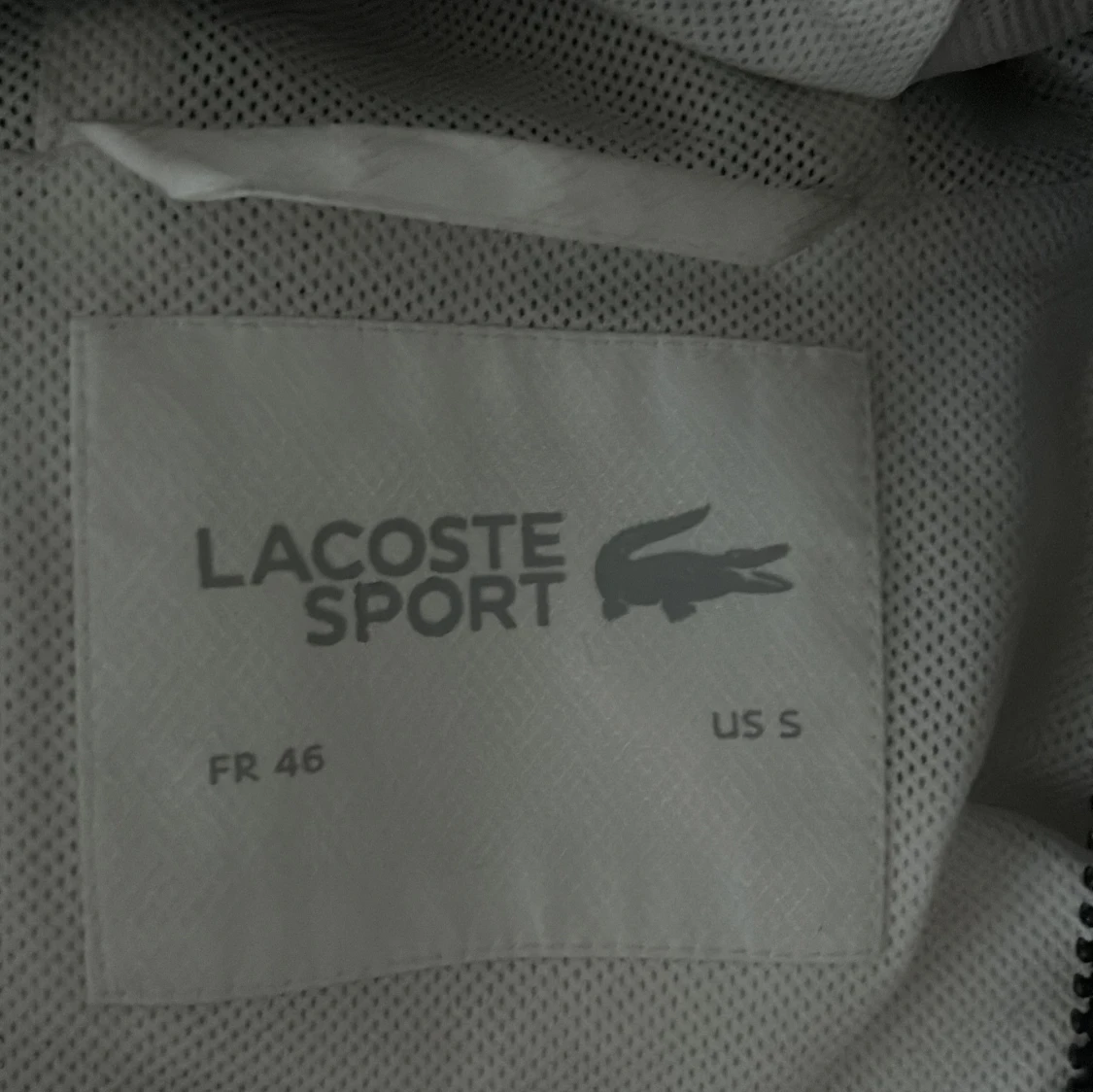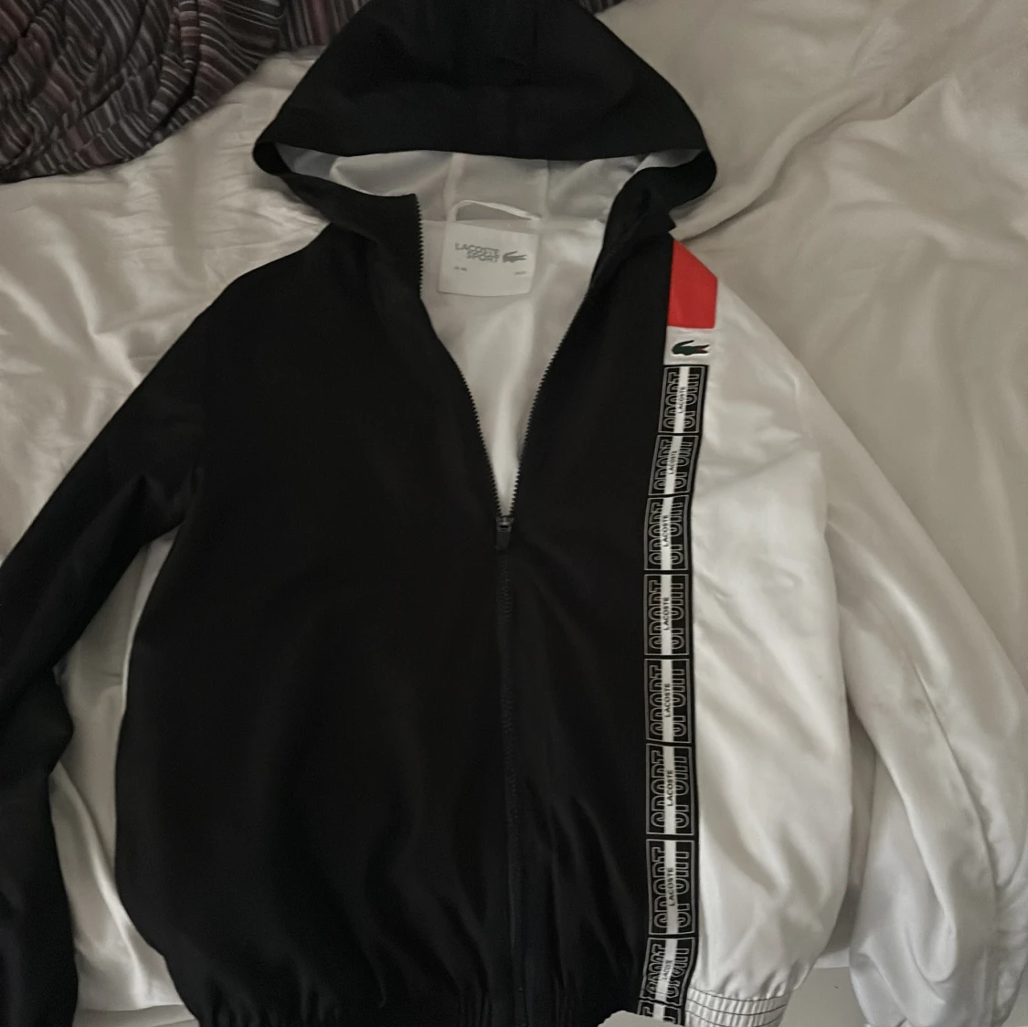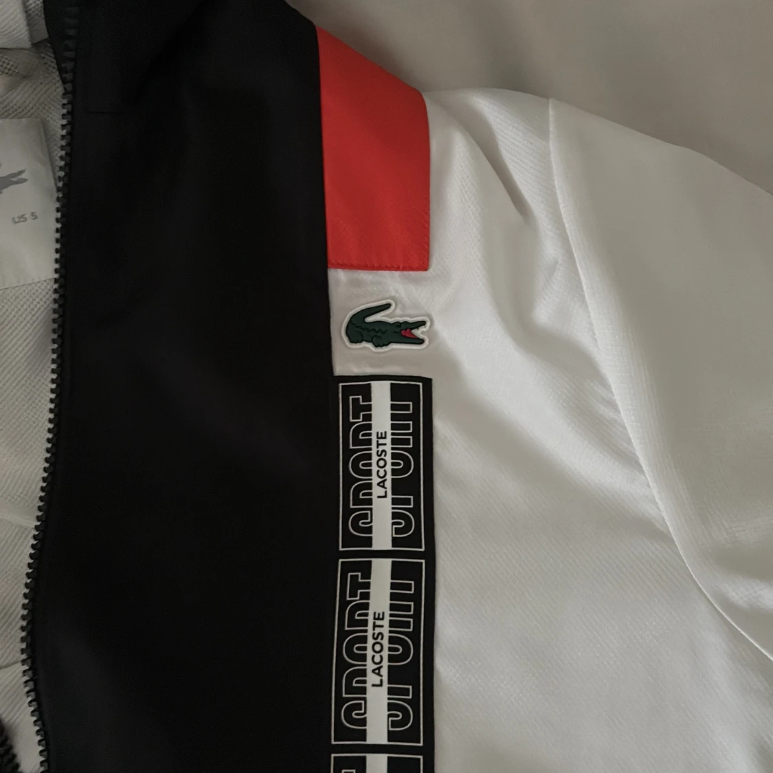 Säljer en snygg svartvit vindjacka från Lacoste Sport med huva och dragkedja. Jackan har en röd detalj på axeln, Lacoste-logga på bröstet och sportiga band längs dragkedjan. Perfekt för en sportig stil.