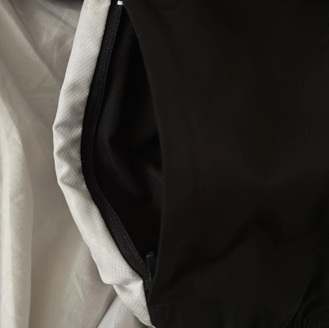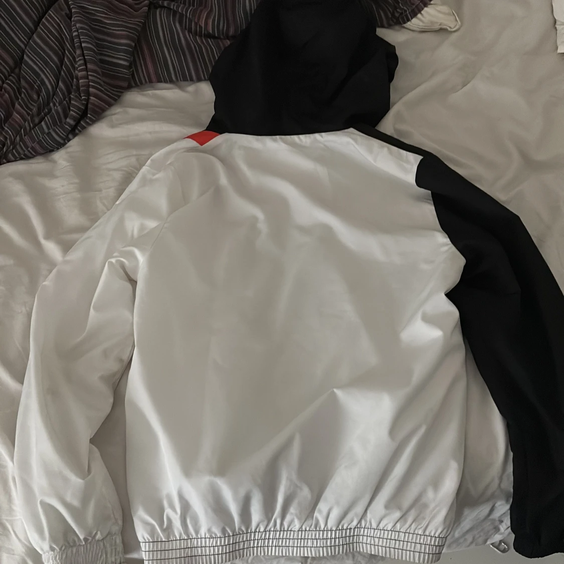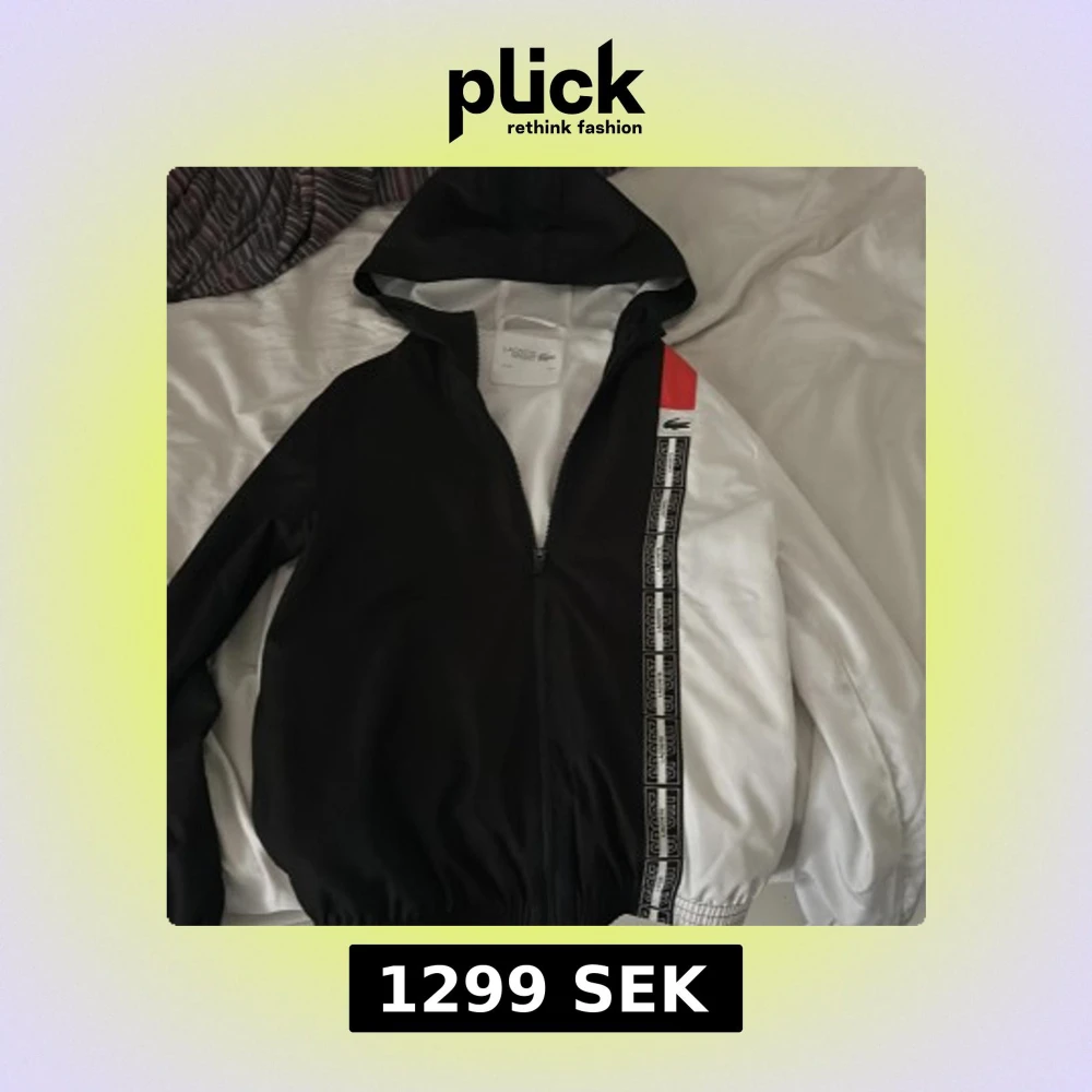 Säljer en snygg svartvit vindjacka från Lacoste Sport med huva och dragkedja. Jackan har en röd detalj på axeln, Lacoste-logga på bröstet och sportiga band längs dragkedjan. Perfekt för en sportig stil.