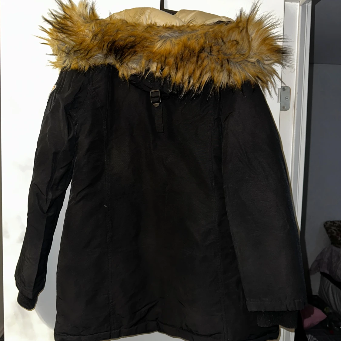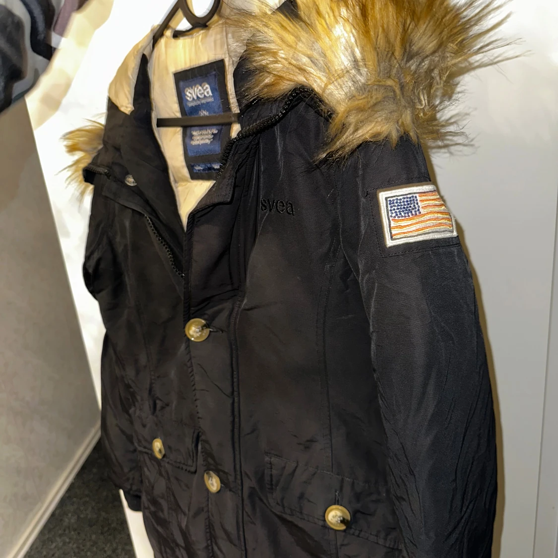 Svart parkasjacka från Svea med beige foder och stor huva med fuskpäls. Jackan har dragkedja och knappar framtill, två stora fickor och en patch med amerikansk flagga på ärmen. Perfekt för kalla dagar och riktigt snygg streetstil.