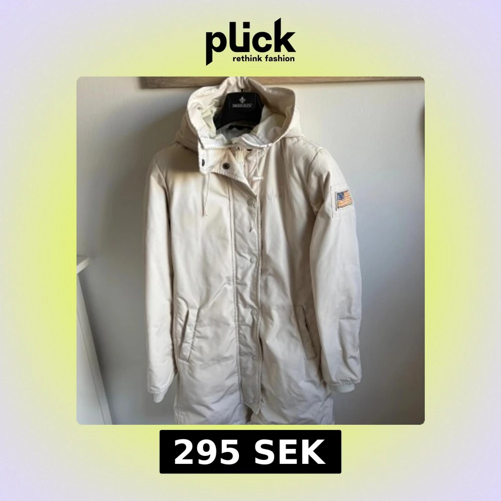 Parkajacka från Svea i beige med broderad amerikansk flagga på ärmen och huva med snörning. Jackan har knappar och dragkedja framtill, två fickor och broderad logga på bröstet. Perfekt för kalla dagar och har en clean, stilren look.
