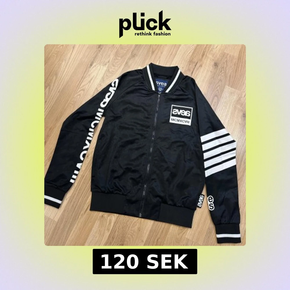 Svart bomberjacka från Svea med vita detaljer och tryck på ärmarna. Jackan har dragkedja framtill, ribbade muddar och en cool logga på bröstet. Materialet är polyester och jackan har en sportig vibe med vita ränder på ena ärmen. Helt oanvänd men fått en liten fläck bak på ryggen.