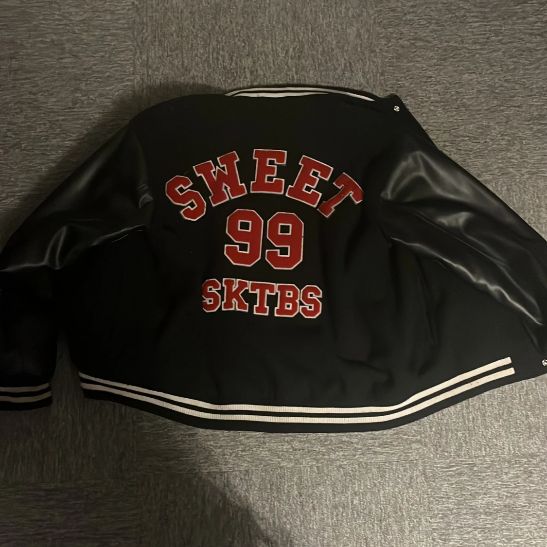 Svart bomberjacka från SKTBS med coola röda detaljer. Stor röd S på bröstet och SWEET 99 SKTBS tryckt på ryggen. Jackan har svarta ärmar i syntetmaterial, vita ränder på muddar och krage samt knappar framtill. Perfekt för dig som gillar streetstyle.