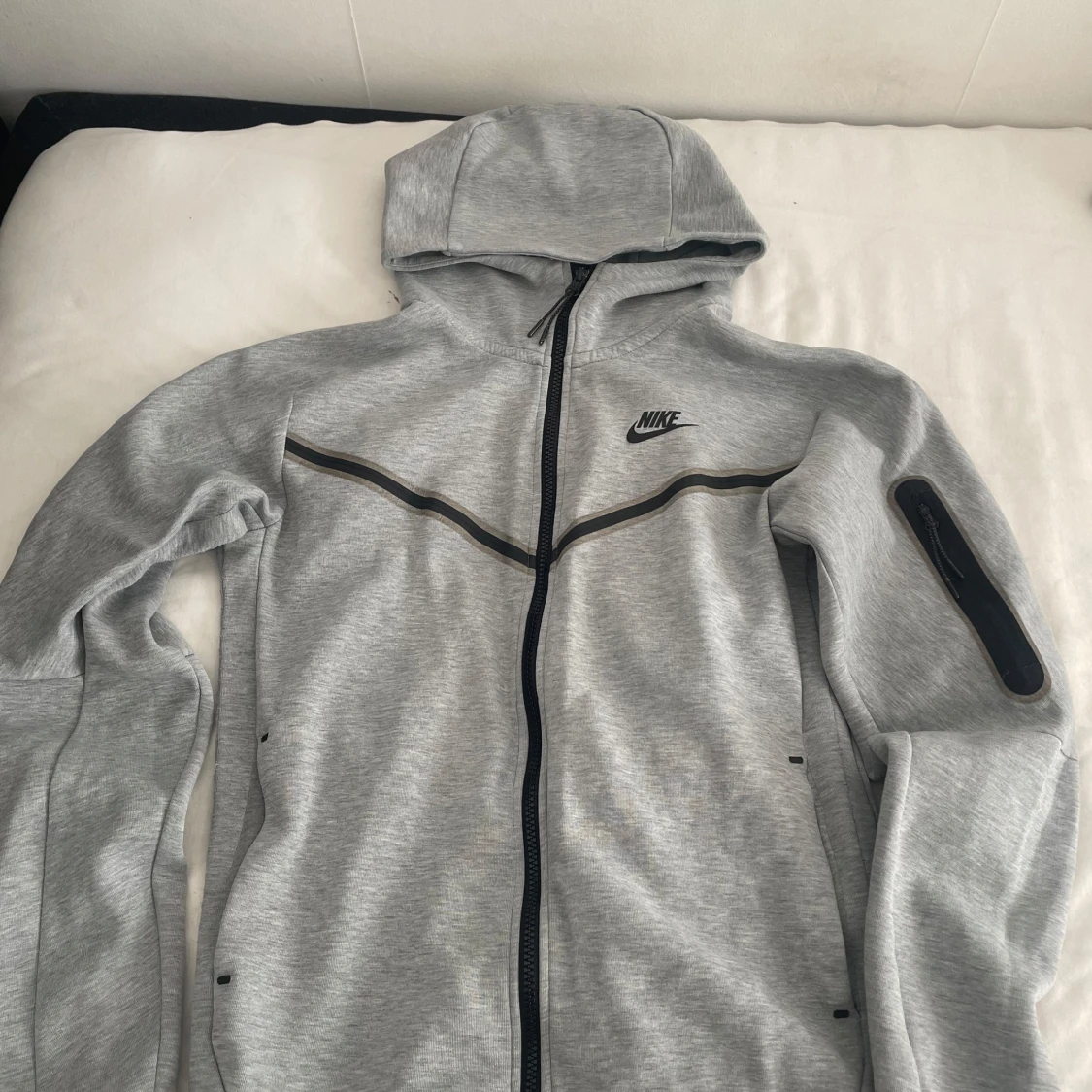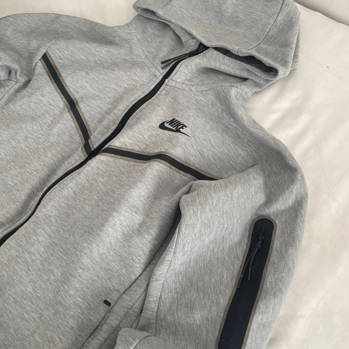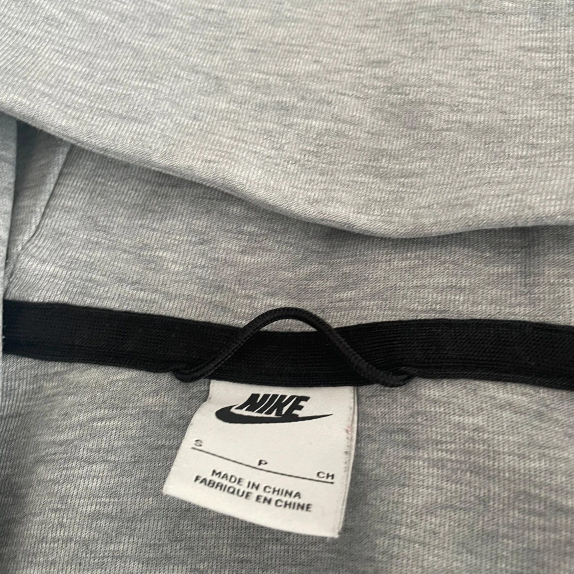 Snygg grå hoodiejacka från Nike med hel dragkedja och svart logga på bröstet. Jackan har huva, svarta detaljer längs bröstet och en praktisk ficka med dragkedja på ärmen. Perfekt för chill eller träning. Helt nya nästan Storlek S