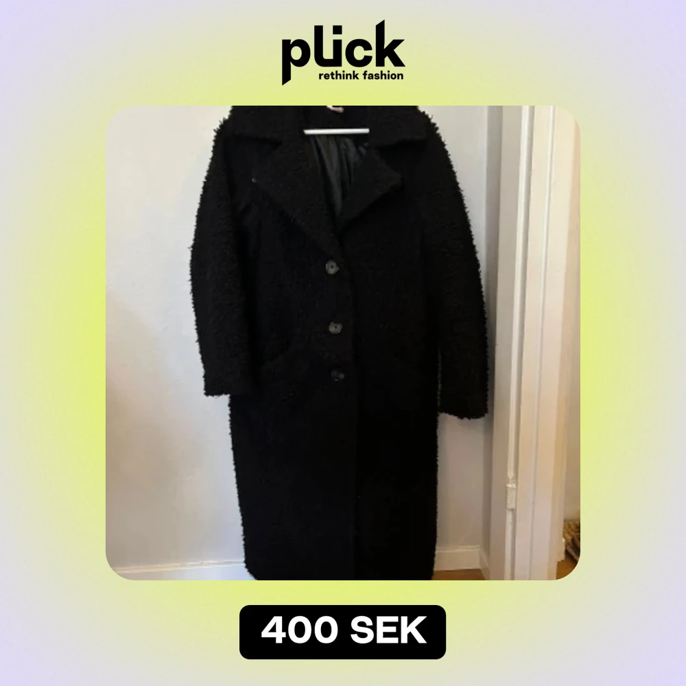 En svart teddykappa från indiska storlek XS. Oversized. Är normalt en stor S eller M. Välanvänd jacka. Har sytt på små hakar (se bild) som knappt syns för att kunna ha kappan knäppt hela vägen upp till halsen vid behov när det är kyligare.