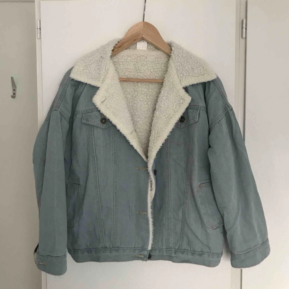 ljusblå jeansjacka med teddyfoder. passar en s/xs i storleken.