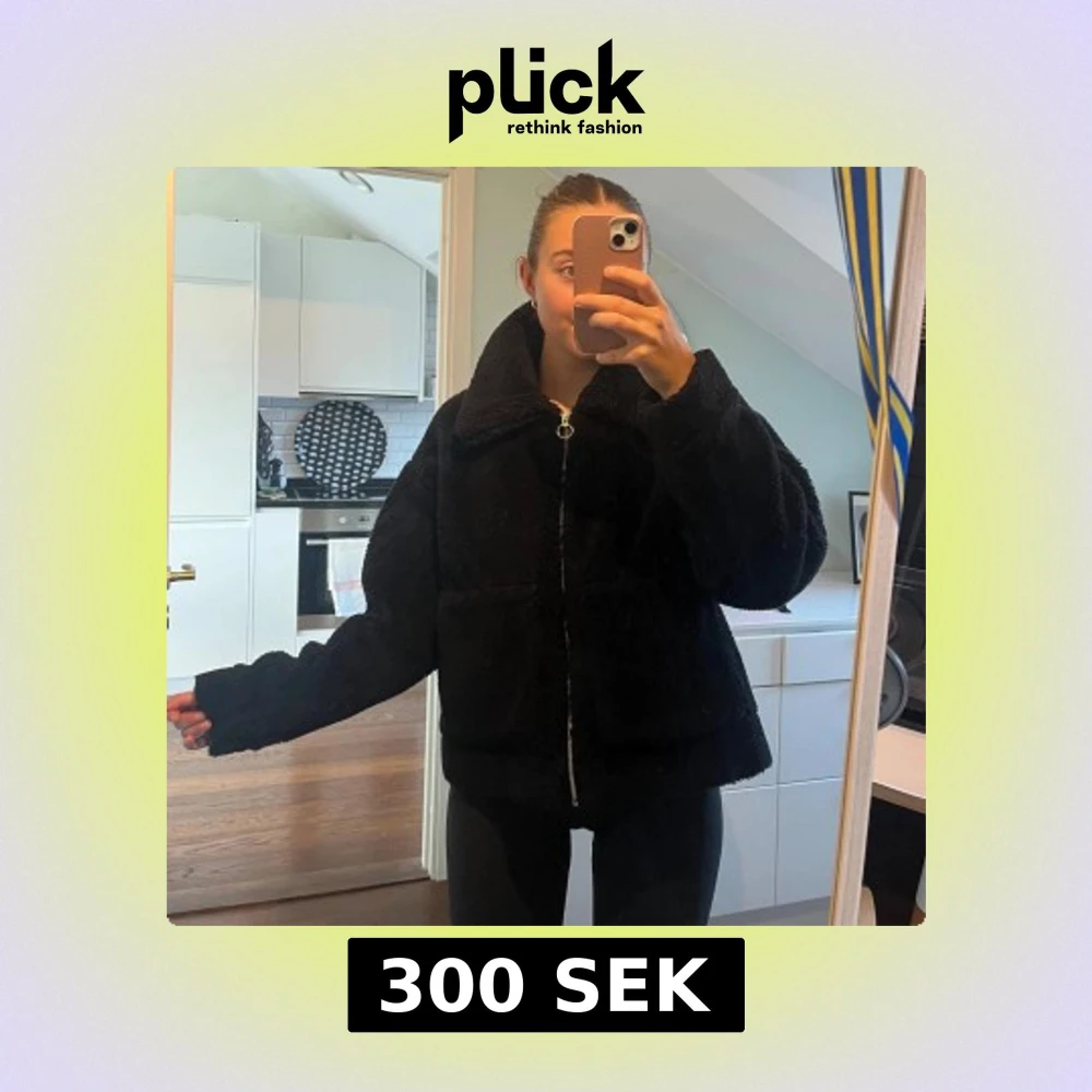 Mjuk och fluffig svart teddyjacka från Bik Bok med stor krage och två rejäla framfickor. Jackan har en metallring på dragkedjan och är lite oversized i modellen.
