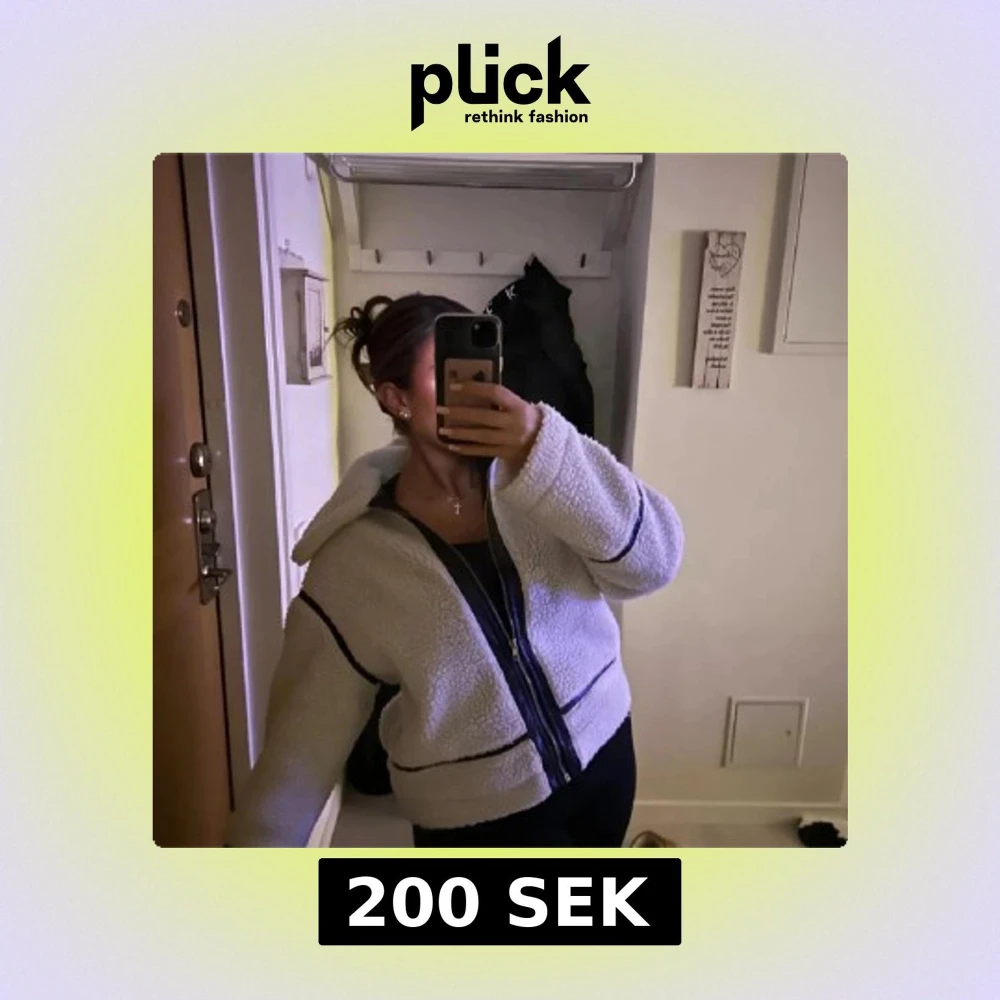 Mysig vit teddyjacka med svarta detaljer och dragkedja framtill. Perfekt för kyliga dagar med sin fluffiga och bekväma design. Jackan har långa ärmar och en avslappnad passform.