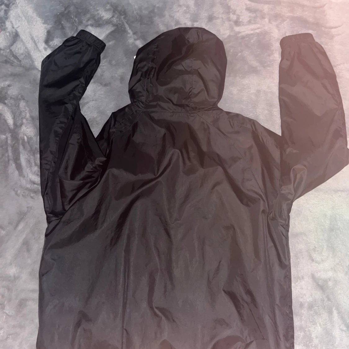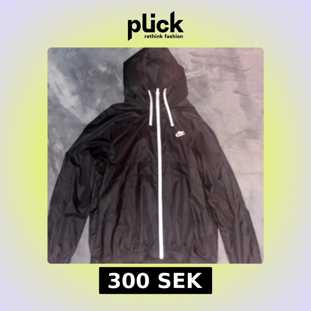 Säljer en svart vindjacka från Nike med huva och dragkedja. Jackan har en klassisk design med Nike-logga på bröstet och justerbara snören vid huvan. Perfekt för blåsiga dagar.