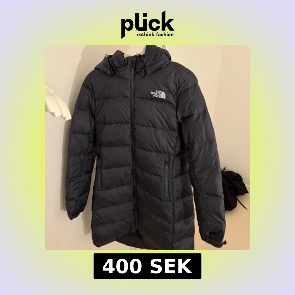 Säljer en svart lång dunjacka från The North Face med huva och dragkedja framtill. Jackan har två sidofickor med dragkedja och är perfekt för kyliga dagar. Klassisk logga på bröstet.
