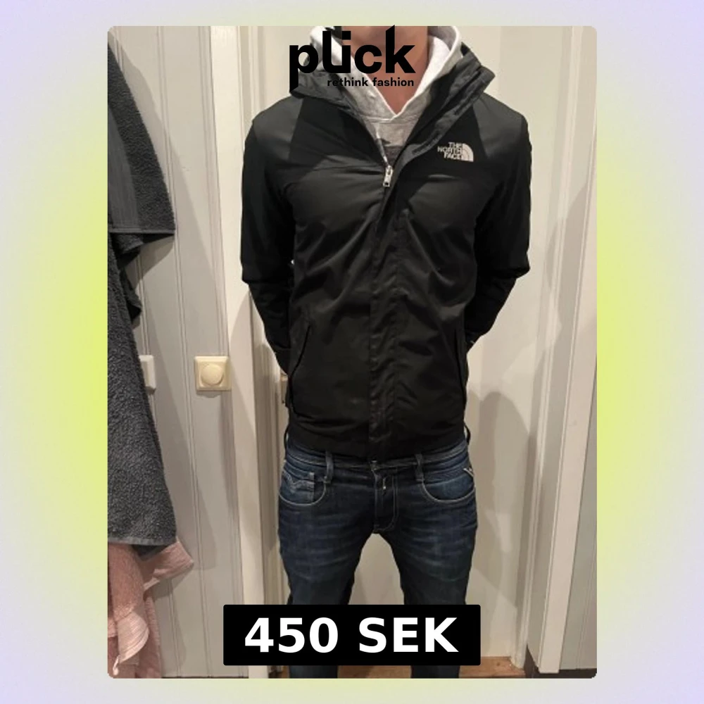 Säljer en svart vindjacka från The North Face med huva och vit logga på bröstet och ryggen. Jackan har dragkedja framtill, två sidofickor och är långärmad. Perfekt för dig som vill ha en stilren och funktionell jacka med snygg passform.