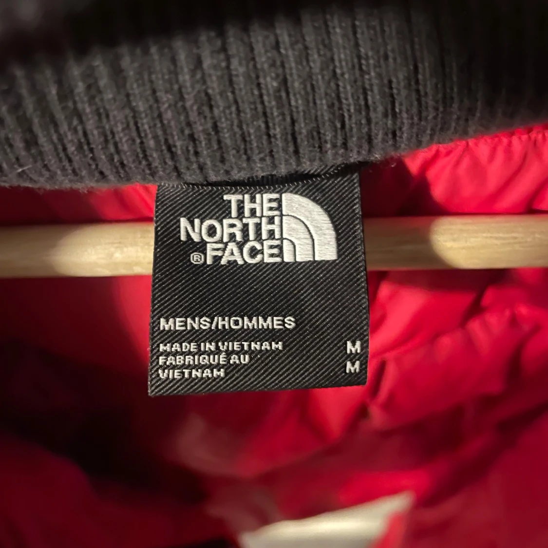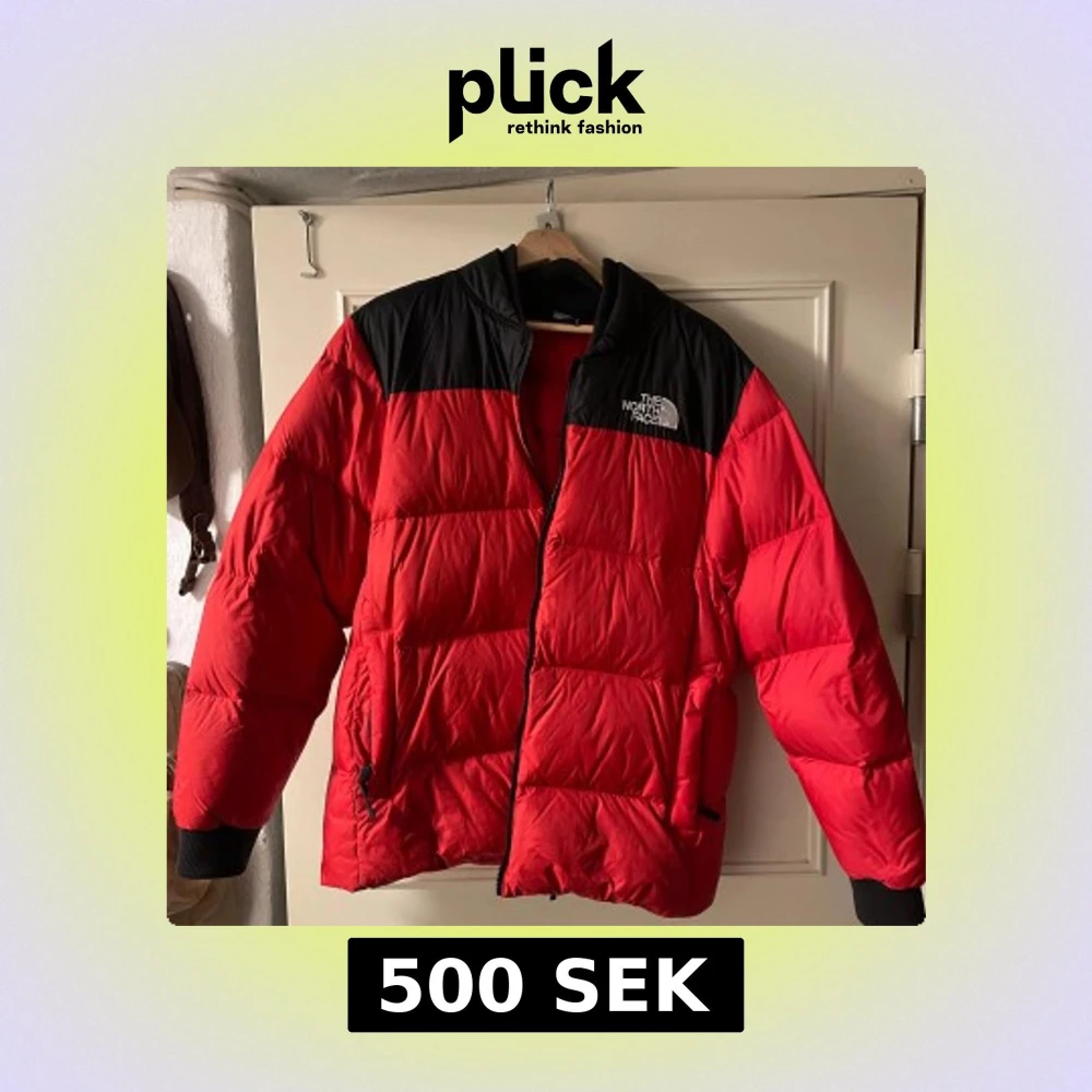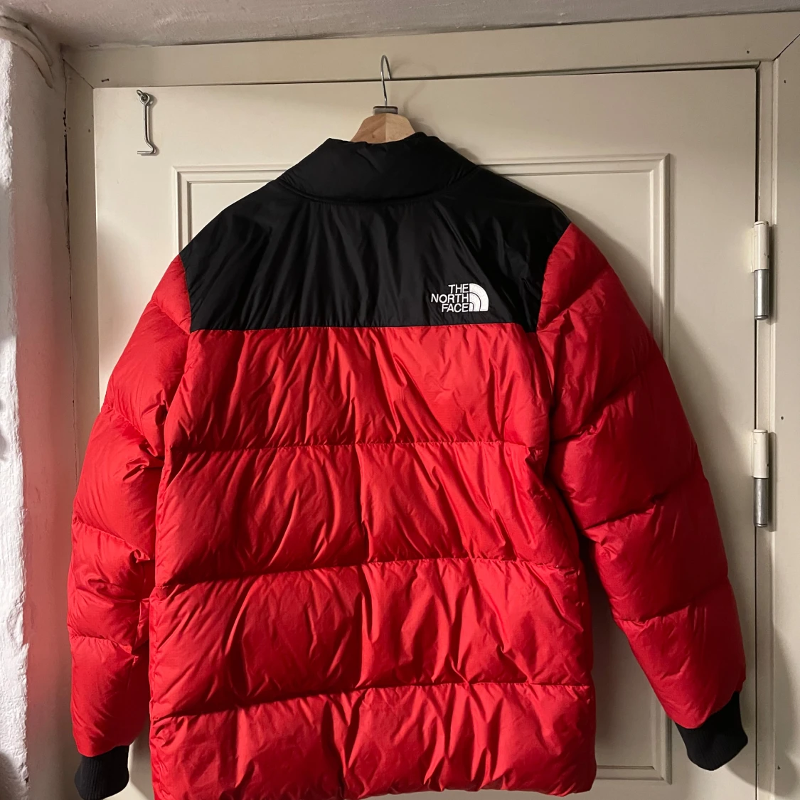 Säljer en röd och svart dunjacka från The North Face. Jackan har en broderad logga på bröstet och ryggen, samt en dragkedja framtill. Den är långärmad och har ribbade muddar. Perfekt för kalla dagar med sin 700-fill power.
