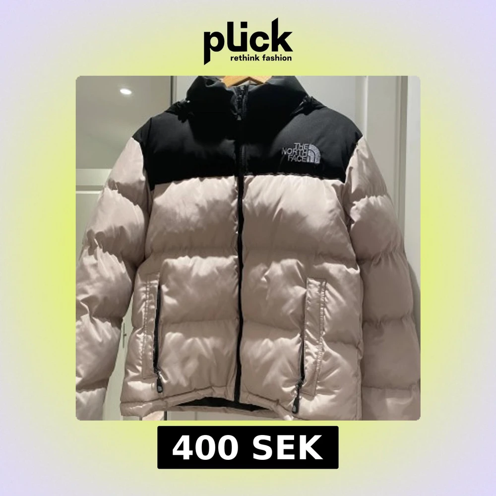 Säljer en beige och svart dunjacka från The North Face med huva och dragkedja framtill. Jackan har två fickor med dragkedja och logga på bröstet. Aldrig använd.