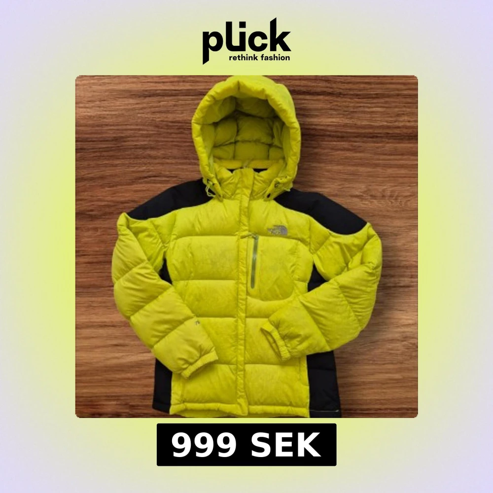 Säljer en gul dunjacka från The North Face med svarta detaljer. Jackan har en huva och en praktisk bröstficka med dragkedja. Perfekt för kalla dagar med sin pufferdesign och långa ärmar. Excellent condition Goose down Warm and puffy Good for medium to large size Ask me if you have questions