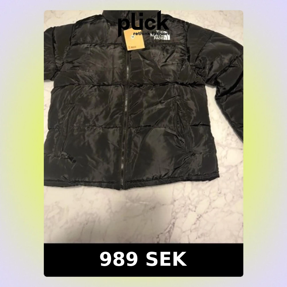 Säljer en svart pufferjacka från The North Face i storlek M. Jackan har en hög krage, dragkedja framtill och två sidofickor. Materialet är glansigt och känns riktigt chill för kalla dagar. Loggan är broderad i vitt på bröstet.