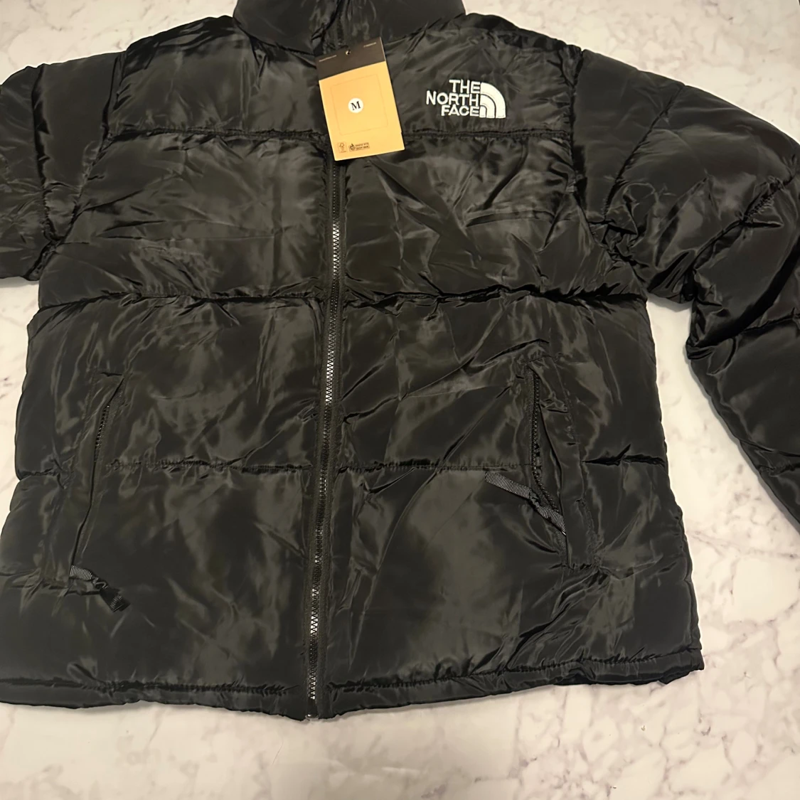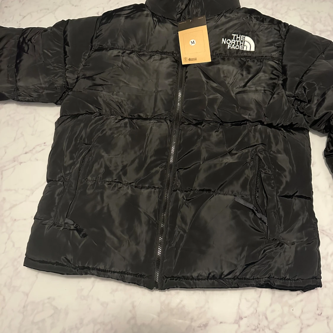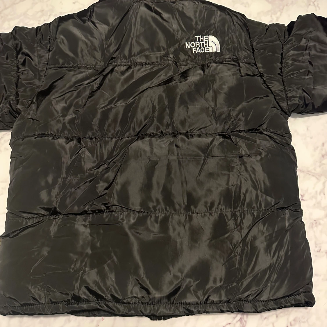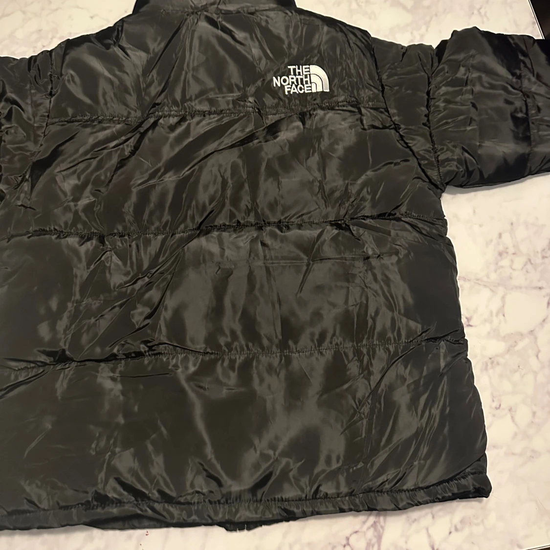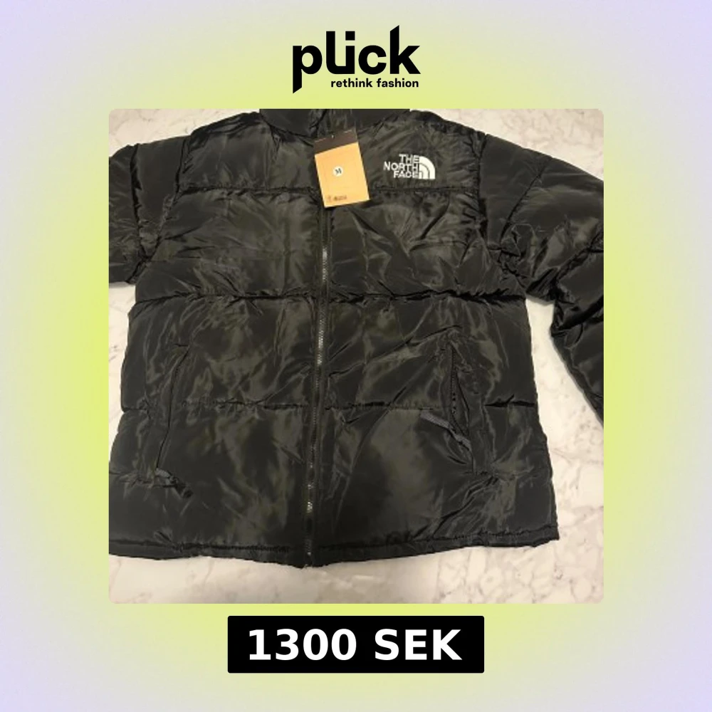 Säljer en svart pufferjacka från The North Face med klassisk logga på bröstet och ryggen. Jackan har dragkedja framtill, två sidofickor med dragkedja och hög krage. Materialet är glansigt och känns riktigt mjukt och skönt.