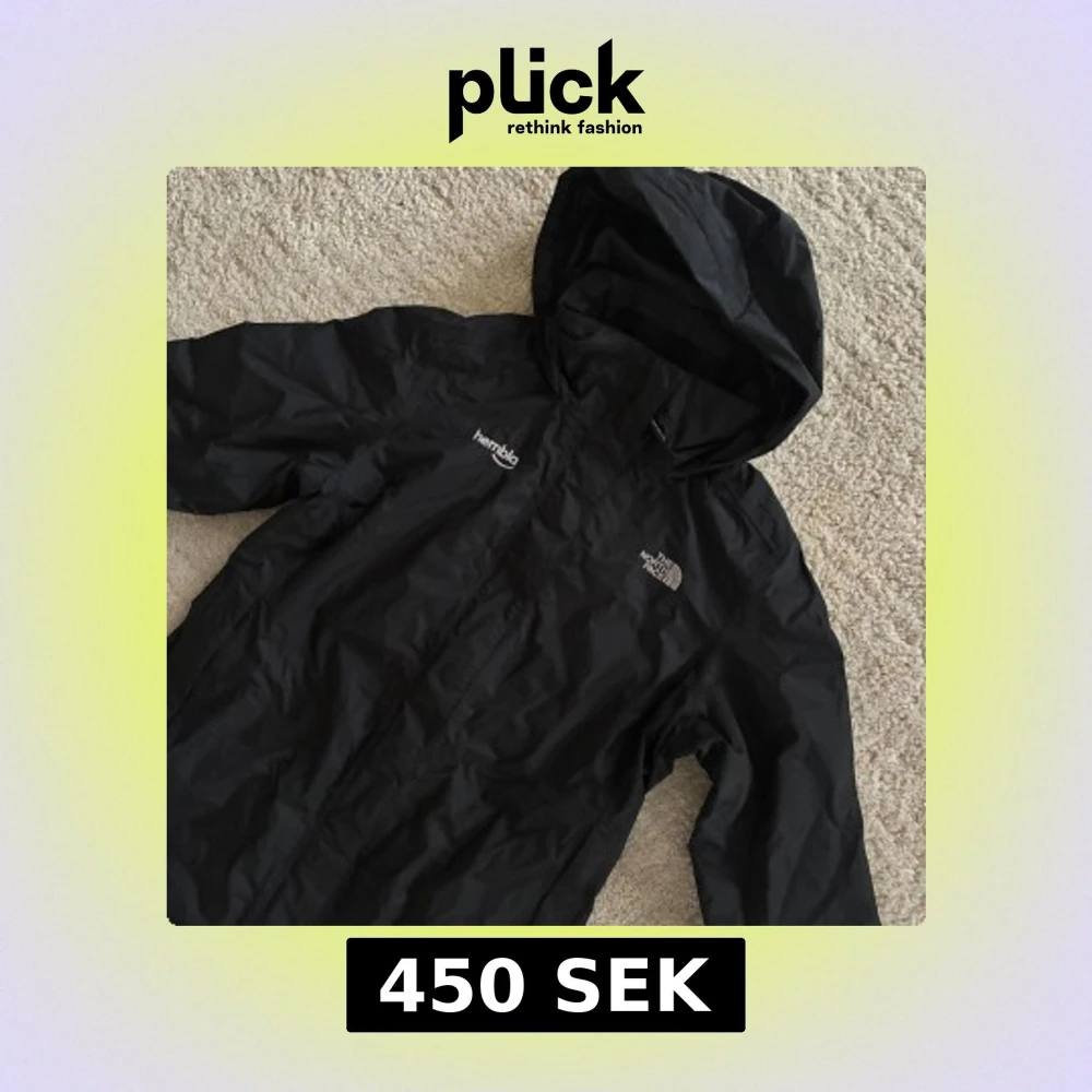 Svart vindjacka med huva från The North Face, med logga på bröstet och 'hembla' tryckt på andra sidan. Jackan har dragkedja framtill och är tillverkad i lätt polyester, perfekt för blåsiga dagar. Snygg och enkel design med långa ärmar och praktiska fickor.