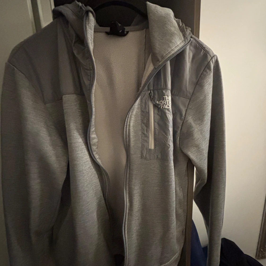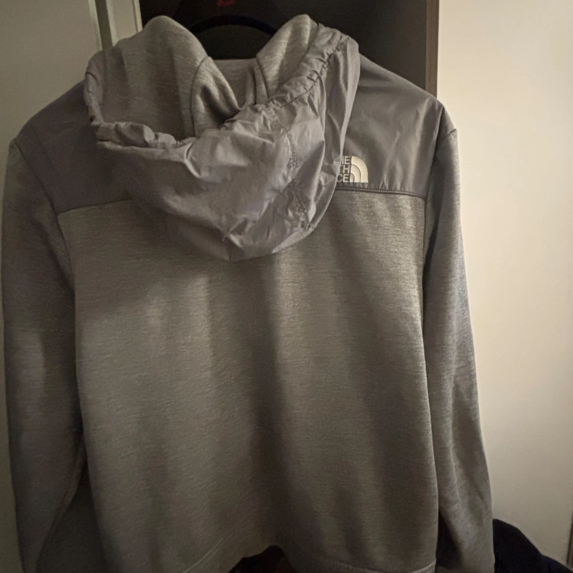 Snygg grå vindjacka från The North Face med huva och dragkedja framtill. Jackan har en bröstficka med dragkedja och logga på bröstet. Perfekt för dig som gillar stilren och sportig look. Materialet är mjukt och lätt, med detaljer i syntet.